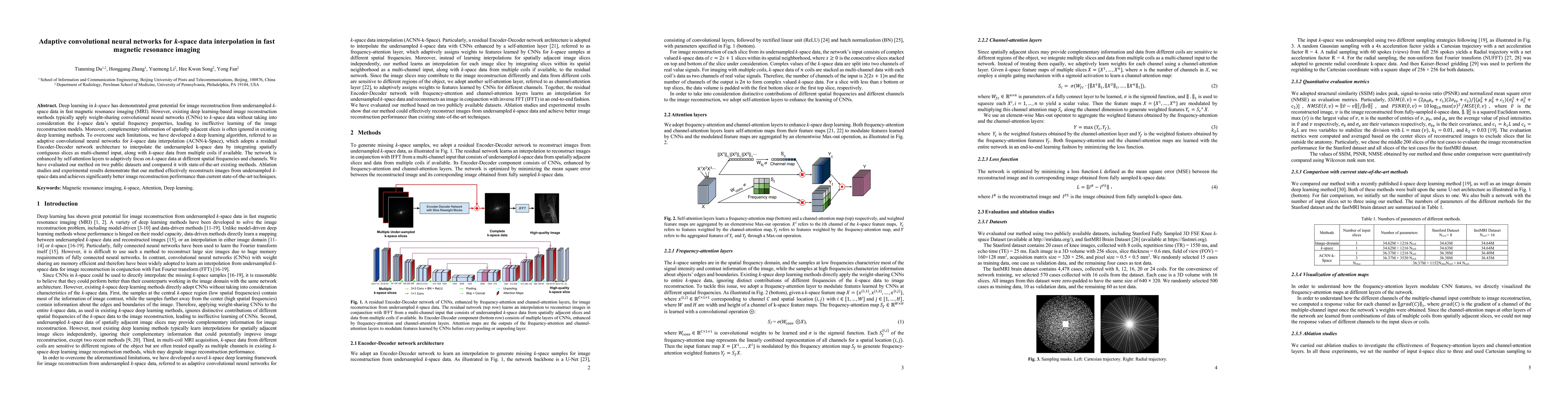 This paper proposes adaptive convolutional neural networks for k-space data interpolation (ACNN-k-Space) to improve MRI image reconstruction from undersampled data. The method uses a residual Encoder-Decoder network with self-attention layers to better capture spatial frequency properties and integrate information from adjacent slices, outperforming existing techniques.
