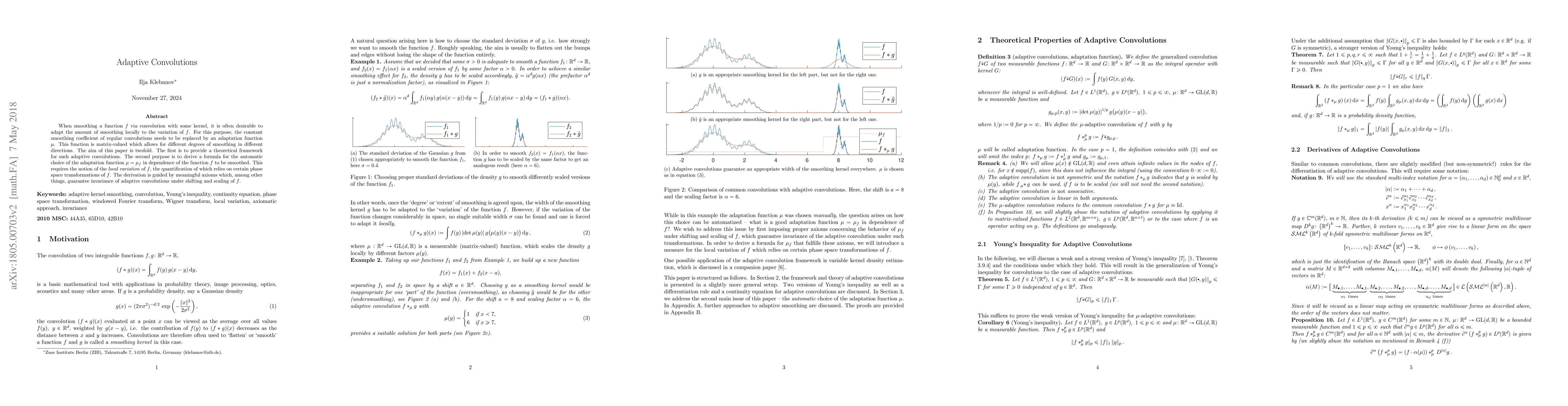 This paper introduces adaptive convolutions that replace constant smoothing coefficients with a matrix-valued adaptation function $\mu$ to tailor smoothing locally based on function variation. It provides a theoretical framework and a method for automatically determining $\mu$ based on the local variation of the function, ensuring invariance under shifting and scaling.
