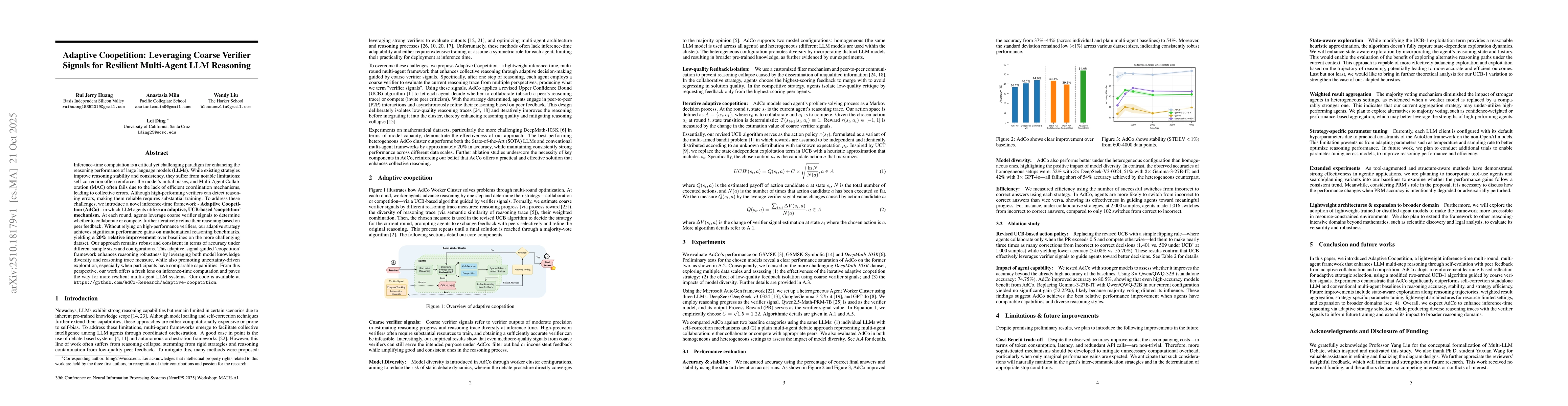 Inference-time computation is a critical yet challenging paradigm for enhancing the reasoning performance of large language models (LLMs). While existing strategies improve reasoning stability and consistency, they suffer from notable limitations: self-correction often reinforces the model's initial biases, and Multi-Agent Collaboration (MAC) often fails due to the lack of efficient coordination mechanisms, leading to collective errors. Although high-performing verifiers can detect reasoning errors, making them reliable requires substantial training. To address these challenges, we introduce a novel inference-time framework, Adaptive Coopetition (AdCo), in which LLM agents utilize an adaptive, UCB-based "coopetition" mechanism. At each round, agents leverage coarse verifier signals to determine whether to collaborate or compete, and iteratively refine their reasoning based on peer feedback. Without relying on high-performance verifiers, our adaptive strategy achieves significant performance gains on mathematical reasoning benchmarks, yielding a 20% relative improvement over baselines on the more challenging dataset. Our approach remains robust and consistent in terms of accuracy under different sample sizes and configurations. This adaptive, signal-guided "coopetition" framework enhances reasoning robustness by leveraging both model knowledge diversity and reasoning trace measures, while also promoting uncertainty-driven exploration, especially when participants have comparable capabilities. From this perspective, our work offers a fresh lens on inference-time computation and paves the way for more resilient multi-agent LLM systems. Our code is available at: https://github.com/AdCo-Research/adaptive-coopetition.