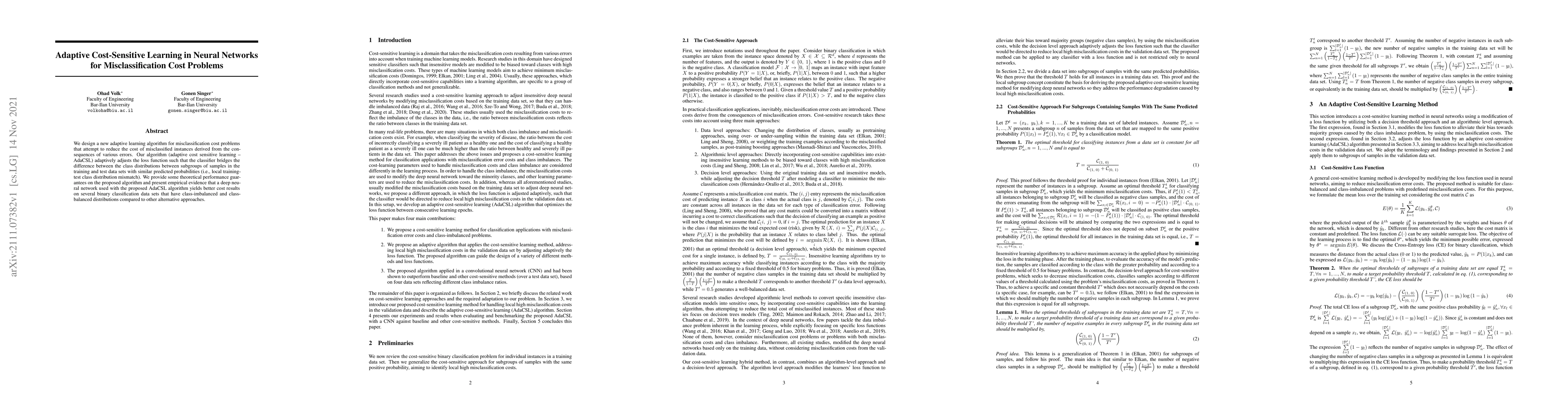 **Summary:** AdaCSL is a novel adaptive learning algorithm that modifies the loss function to address misclassification costs, particularly in imbalanced datasets. Empirical results show it improves classification performance in both imbalanced and balanced datasets compared to other methods.