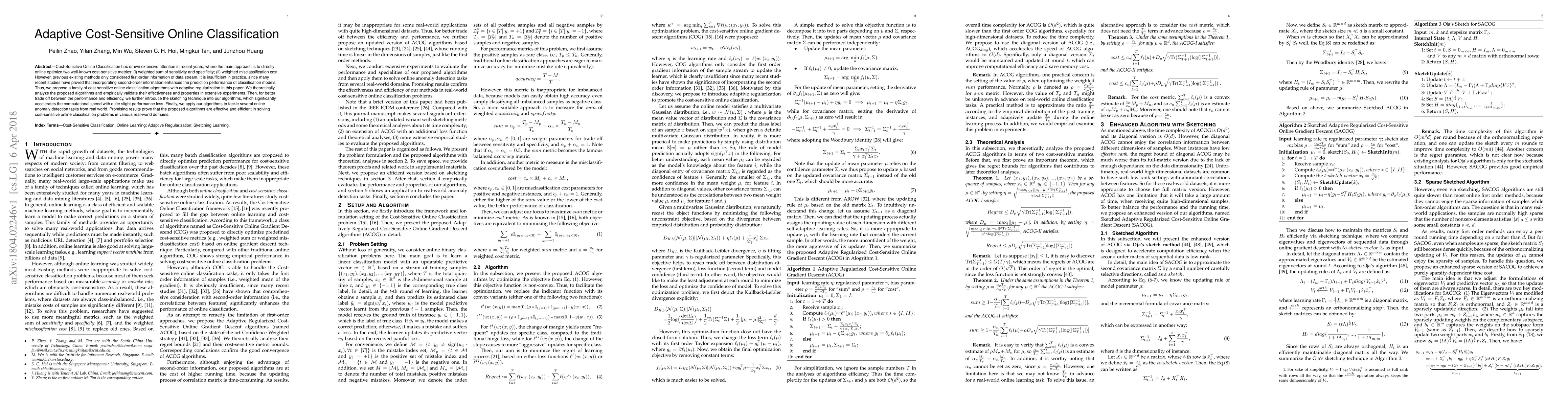 This paper proposes adaptive regularization algorithms for cost-sensitive online classification, incorporating second-order data information to improve prediction performance. The algorithms are theoretically analyzed and empirically validated, showing effective trade-offs between performance and efficiency, especially with the introduction of sketching techniques.
