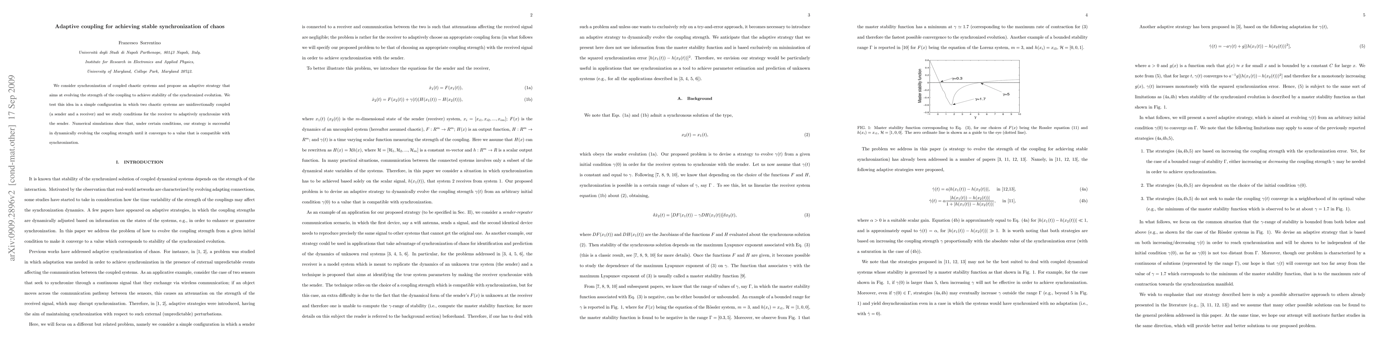 The research proposes an adaptive strategy to stabilize synchronization in coupled chaotic systems. Numerical simulations demonstrate that this adaptive coupling method successfully evolves and converges to a stable coupling strength for synchronization in a sender-receiver configuration.