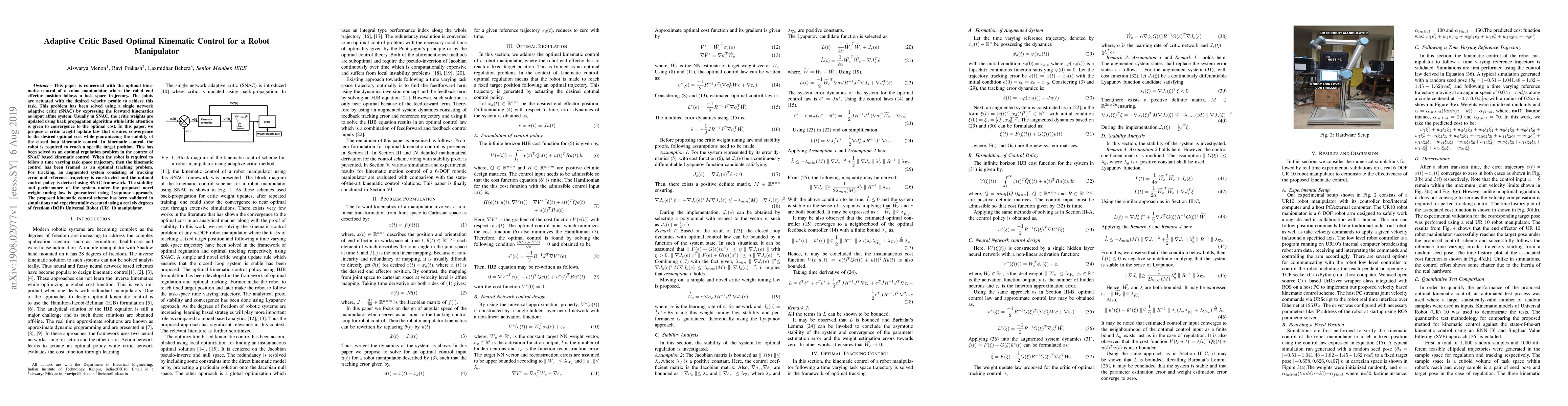 This paper proposes an adaptive critic-based optimal kinematic control method for robot manipulators, ensuring convergence to the optimal cost and stability through a novel weight update law. The method addresses both regulation and tracking tasks, validated both in simulations and on a real six-DOF Universal Robot.