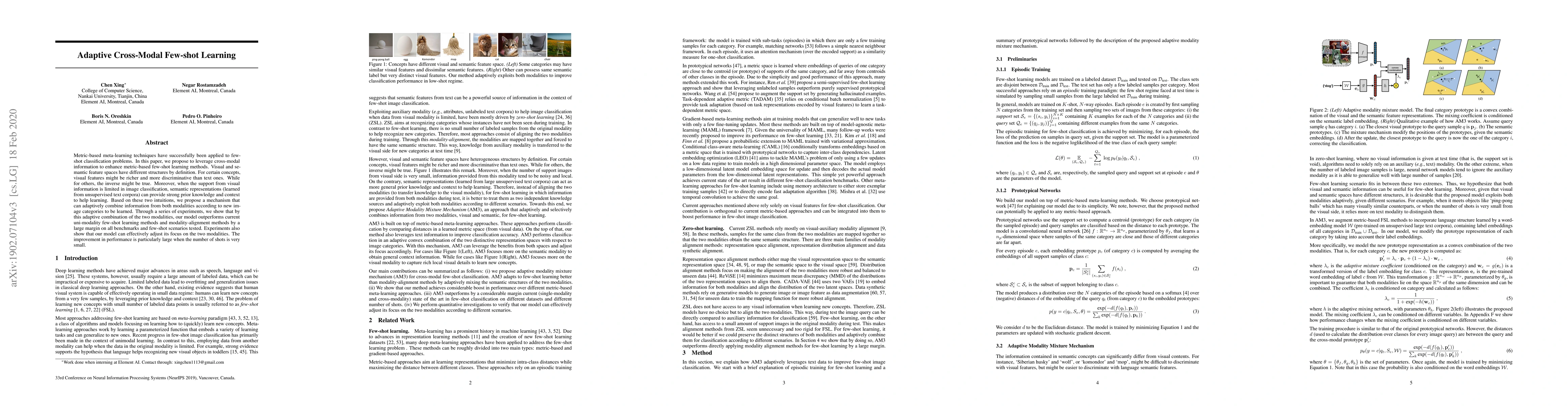 This paper proposes an adaptive cross-modal few-shot learning method that leverages both visual and semantic information to enhance metric-based few-shot classification. The model adaptively combines these modalities based on the new image categories, significantly outperforming uni-modal and modality-alignment methods, especially with limited training data.