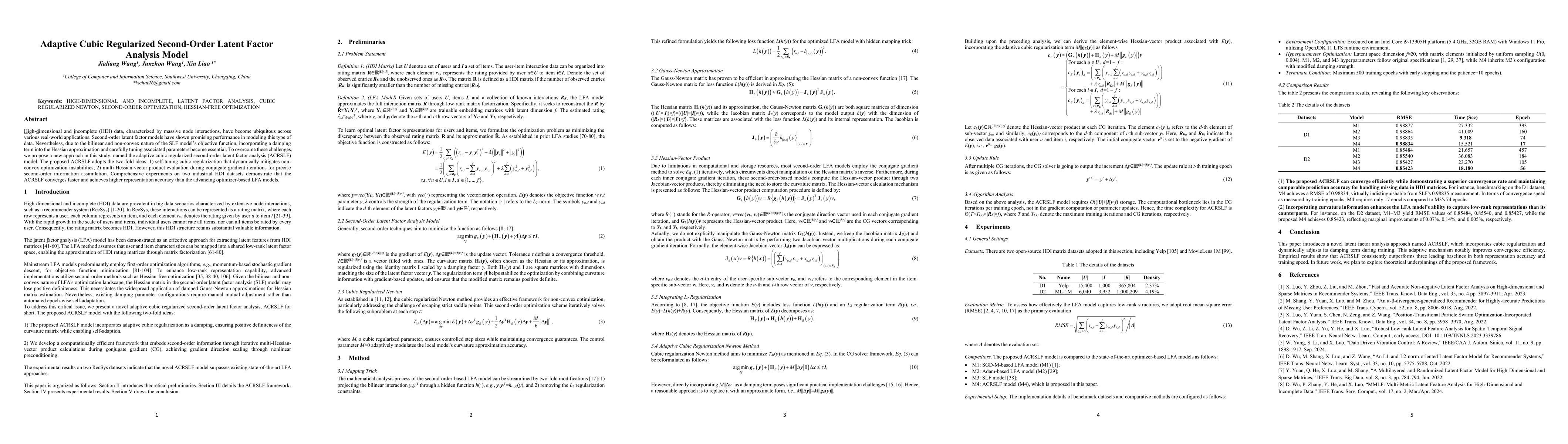 High-dimensional and incomplete (HDI) data, characterized by massive node interactions, have become ubiquitous across various real-world applications. Second-order latent factor models have shown promising performance in modeling this type of data. Nevertheless, due to the bilinear and non-convex nature of the SLF model's objective function, incorporating a damping term into the Hessian approximation and carefully tuning associated parameters become essential. To overcome these challenges, we propose a new approach in this study, named the adaptive cubic regularized second-order latent factor analysis (ACRSLF) model. The proposed ACRSLF adopts the two-fold ideas: 1) self-tuning cubic regularization that dynamically mitigates non-convex optimization instabilities; 2) multi-Hessian-vector product evaluation during conjugate gradient iterations for precise second-order information assimilation. Comprehensive experiments on two industrial HDI datasets demonstrate that the ACRSLF converges faster and achieves higher representation accuracy than the advancing optimizer-based LFA models.