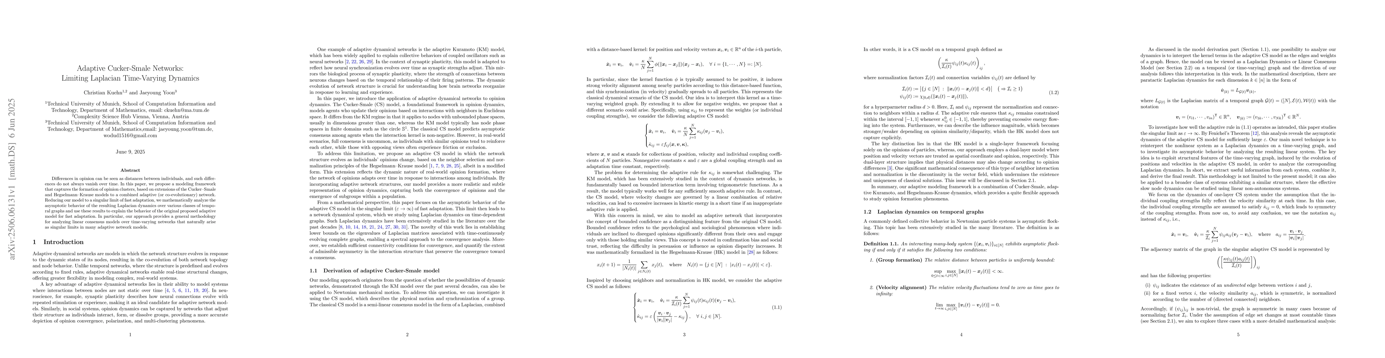 Differences in opinion can be seen as distances between individuals, and such differences do not always vanish over time. In this paper, we propose a modeling framework that captures the formation of opinion clusters, based on extensions of the Cucker Smale and Hegselmann Krause models to a combined adaptive (or co-evolutionary) network. Reducing our model to a singular limit of fast adaptation, we mathematically analyze the asymptotic behavior of the resulting Laplacian dynamics over various classes of temporal graphs and use these results to explain the behavior of the original proposed adaptive model for fast adaptation. In particular, our approach provides a general methodology for analyzing linear consensus models over time-varying networks that naturally arise as singular limits in many adaptive network models.