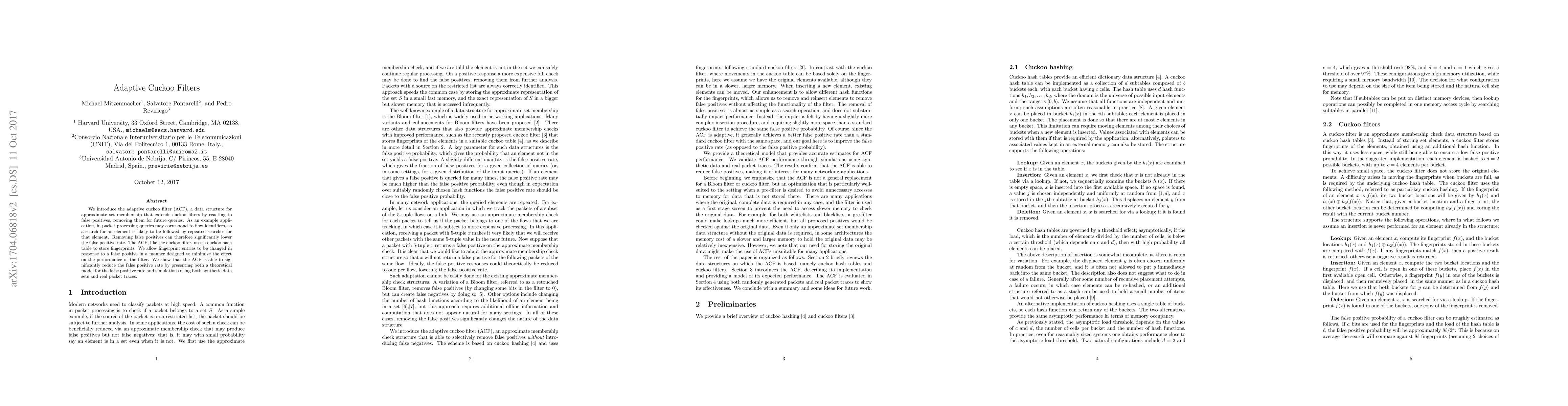 The adaptive cuckoo filter (ACF) extends cuckoo filters to dynamically adjust and reduce false positives by reacting to them, thereby lowering the false positive rate in applications like packet processing. The ACF maintains performance while minimizing the impact of these adjustments through a cuckoo hash table and theoretical modeling, supported by simulations.