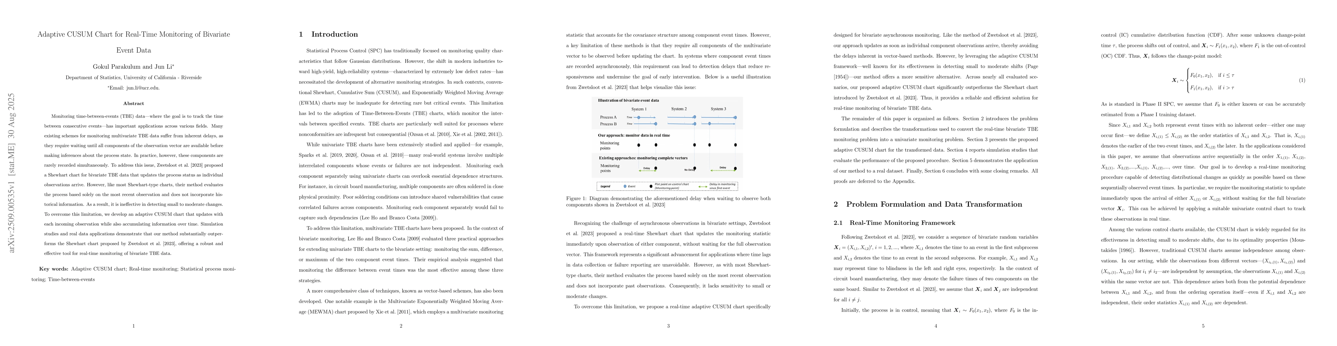 Monitoring time-between-events (TBE) data, where the goal is to track the time between consecutive events, has important applications across various fields. Many existing schemes for monitoring multivariate TBE data suffer from inherent delays, as they require waiting until all components of the observation vector are available before making inferences about the process state. In practice, however, these components are rarely recorded simultaneously. To address this issue, Zwetsloot et al. proposed a Shewhart chart for bivariate TBE data that updates the process status as individual observations arrive. However, like most Shewhart-type charts, their method evaluates the process based solely on the most recent observation and does not incorporate historical information. As a result, it is ineffective in detecting small to moderate changes. To overcome this limitation, we develop an adaptive CUSUM chart that updates with each incoming observation while also accumulating information over time. Simulation studies and real-data applications demonstrate that our method substantially outperforms the Shewhart chart of Zwetsloot et al., offering a robust and effective tool for real-time monitoring of bivariate TBE data.