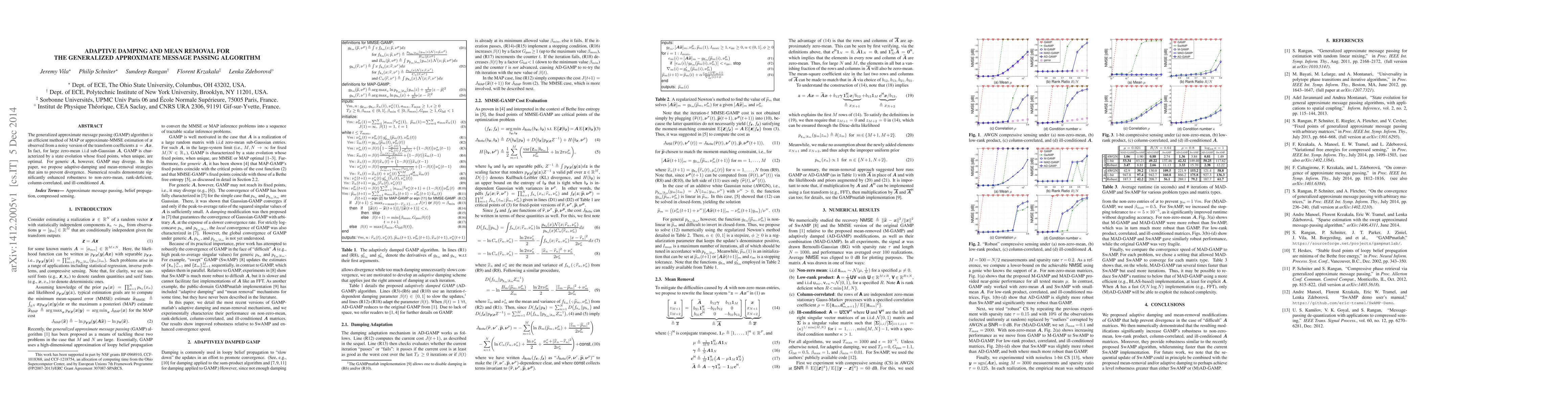 The generalized approximate message passing (GAMP) algorithm is an efficient method of MAP or approximate-MMSE estimation of $x$ observed from a noisy version of the transform coefficients $z = Ax$. In fact, for large zero-mean i.i.d sub-Gaussian $A$, GAMP is characterized by a state evolution whose fixed points, when unique, are optimal. For generic $A$, however, GAMP may diverge. In this paper, we propose adaptive damping and mean-removal strategies that aim to prevent divergence. Numerical results demonstrate significantly enhanced robustness to non-zero-mean, rank-deficient, column-correlated, and ill-conditioned $A$.
