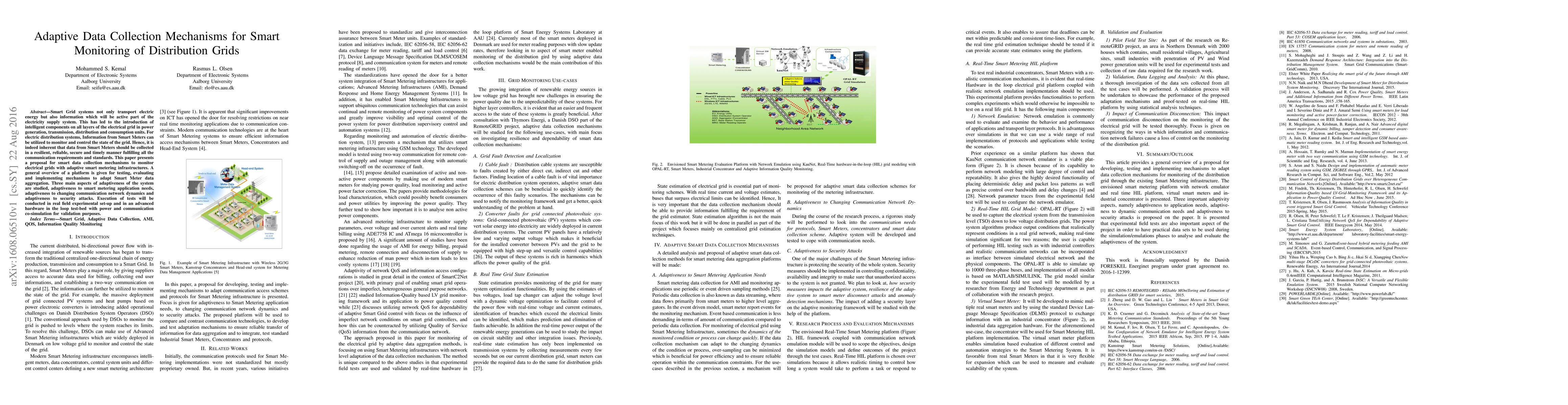 Smart Grid systems not only transport electric energy but also information which will be active part of the electricity supply system. This has led to the introduction of intelligent components on all layers of the electrical grid in power generation, transmission, distribution and consumption units. For electric distribution systems, Information from Smart Meters can be utilized to monitor and control the state of the grid. Hence, it is indeed inherent that data from Smart Meters should be collected in a resilient, reliable, secure and timely manner fulfilling all the communication requirements and standards. This paper presents a proposal for smart data collection mechanisms to monitor electrical grids with adaptive smart metering infrastructures. A general overview of a platform is given for testing, evaluating and implementing mechanisms to adapt Smart Meter data aggregation. Three main aspects of adaptiveness of the system are studied, adaptiveness to smart metering application needs, adaptiveness to changing communication network dynamics and adaptiveness to security attacks. Execution of tests will be conducted in real field experimental set-up and in an advanced hardware in the loop test-bed with power and communication co-simulation for validation purposes.