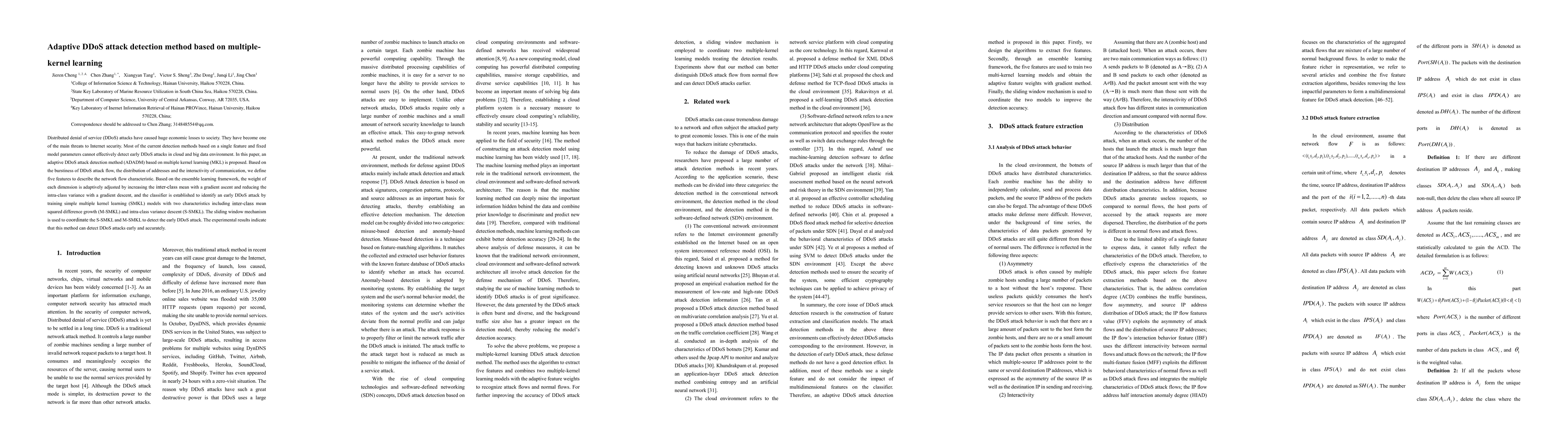 This paper proposes an adaptive DDoS attack detection method (ADADM) using multiple kernel learning (MKL) to effectively identify early attacks based on network flow characteristics. The method adaptively adjusts feature weights and employs ensemble learning to enhance detection accuracy.