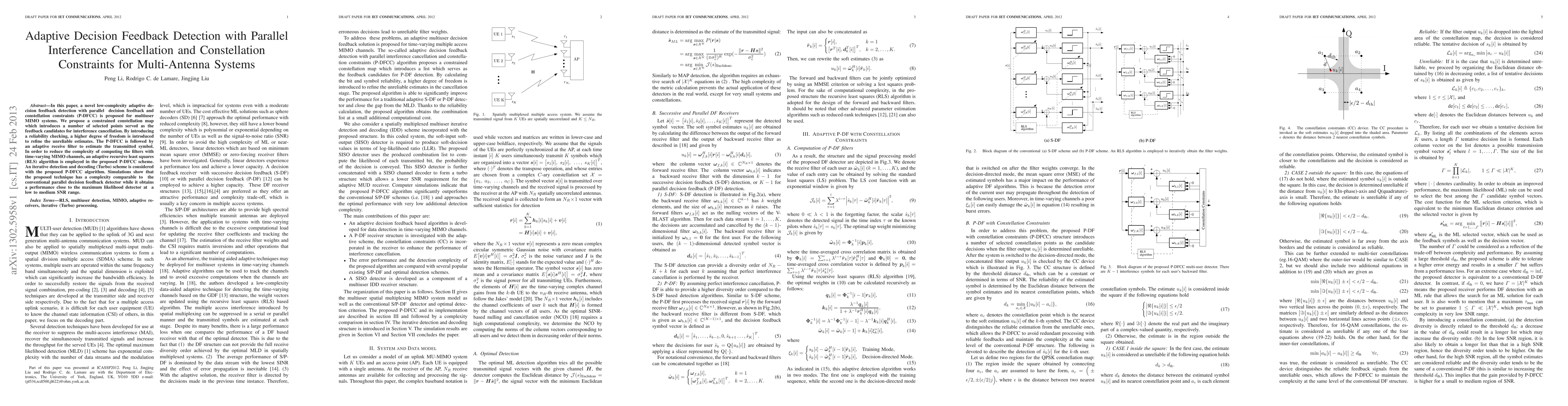 This paper proposes a low-complexity adaptive decision feedback detection method with parallel interference cancellation and constellation constraints (P-DFCC) for multiuser MIMO systems. The P-DFCC employs an adaptive recursive least squares algorithm to manage time-varying channels, achieving performance near the maximum likelihood detector with comparable complexity.