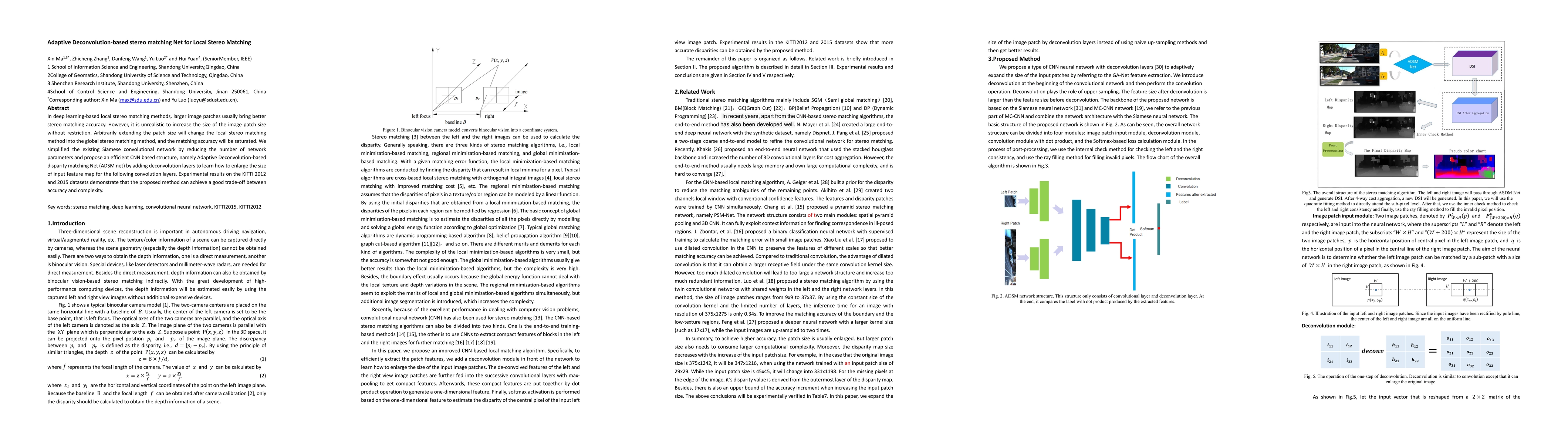 The paper proposes an Adaptive Deconvolution-based disparity matching Net (ADSM net) to improve local stereo matching accuracy by efficiently using larger image patches without transitioning to global stereo matching. Experimental results show that ADSM net achieves a good balance between accuracy and computational complexity on KITTI datasets.