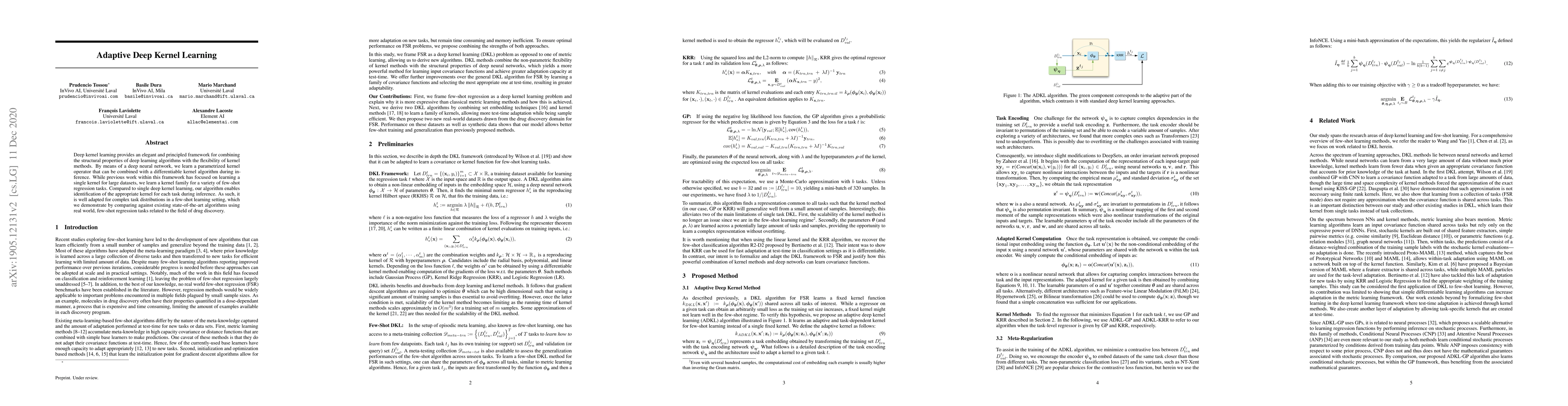 This paper proposes adaptive deep kernel learning to combine deep learning and kernel methods, enabling the learning of a kernel family for few-shot regression tasks. The approach identifies the most suitable kernel for each task during inference, demonstrating superior performance in few-shot learning scenarios, particularly in drug discovery applications.