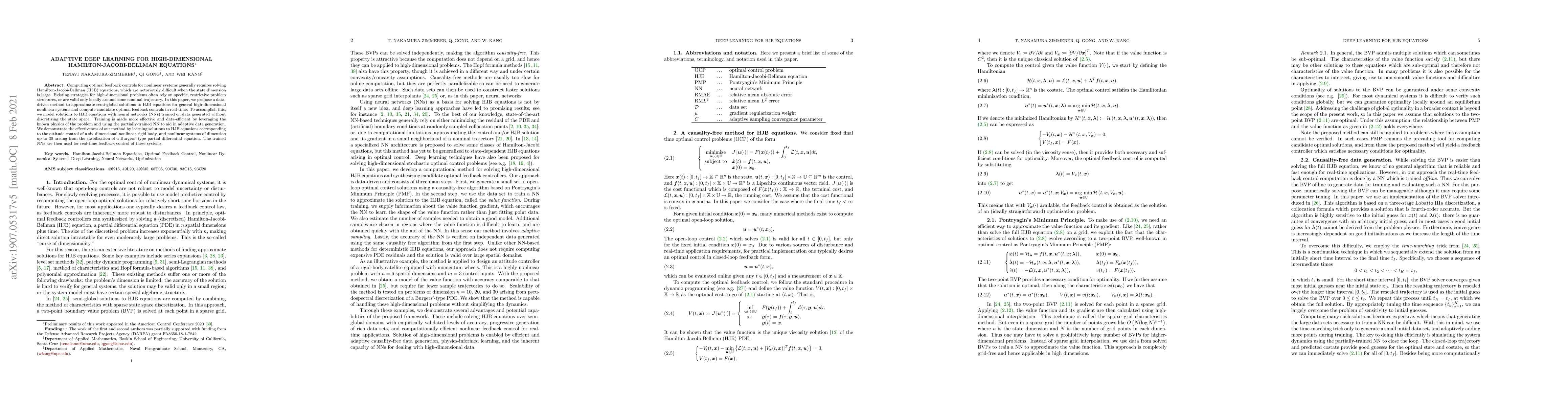 Computing optimal feedback controls for nonlinear systems generally requires solving Hamilton-Jacobi-Bellman (HJB) equations, which are notoriously difficult when the state dimension is large. Existing strategies for high-dimensional problems often rely on specific, restrictive problem structures, or are valid only locally around some nominal trajectory. In this paper, we propose a data-driven method to approximate semi-global solutions to HJB equations for general high-dimensional nonlinear systems and compute candidate optimal feedback controls in real-time. To accomplish this, we model solutions to HJB equations with neural networks (NNs) trained on data generated without discretizing the state space. Training is made more effective and data-efficient by leveraging the known physics of the problem and using the partially-trained NN to aid in adaptive data generation. We demonstrate the effectiveness of our method by learning solutions to HJB equations corresponding to the attitude control of a six-dimensional nonlinear rigid body, and nonlinear systems of dimension up to 30 arising from the stabilization of a Burgers'-type partial differential equation. The trained NNs are then used for real-time feedback control of these systems.