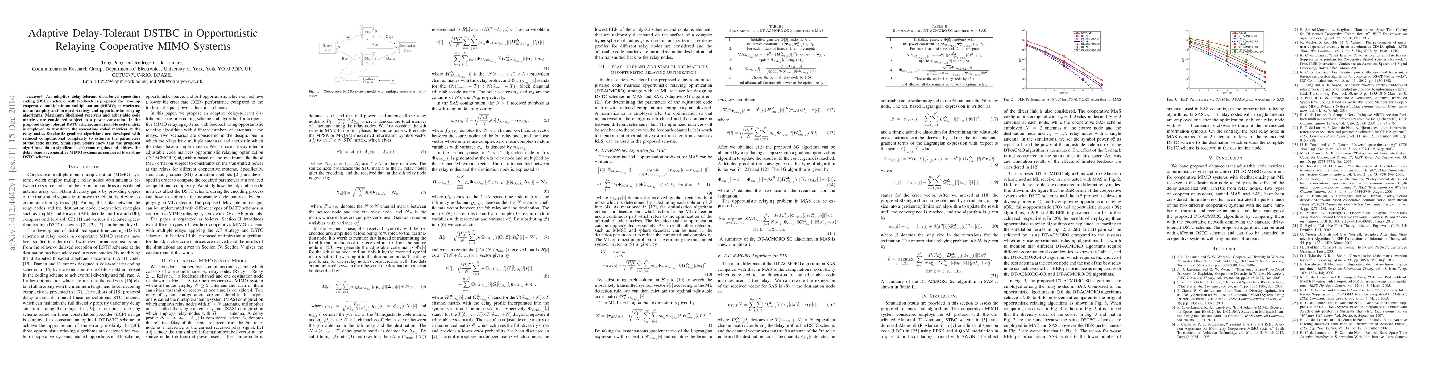 This paper proposes an adaptive delay-tolerant distributed space-time coding (DSTC) scheme for cooperative MIMO networks using opportunistic relaying. The scheme employs adjustable code matrices and stochastic gradient algorithms to optimize performance while addressing delay issues.