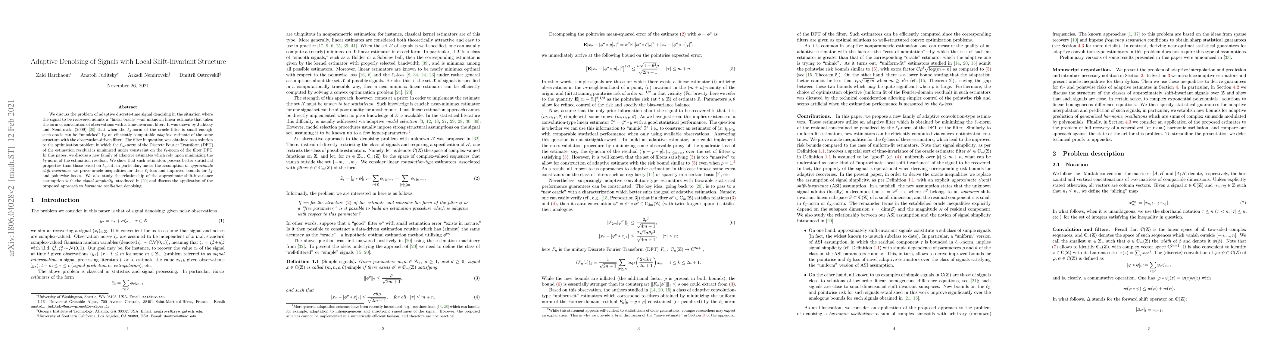 We discuss the problem of adaptive discrete-time signal denoising in the situation where the signal to be recovered admits a "linear oracle" -- an unknown linear estimate that takes the form of convolution of observations with a time-invariant filter. It was shown by Juditsky and Nemirovski (2009) that when the $\ell_2$-norm of the oracle filter is small enough, such oracle can be "mimicked" by an efficiently computable adaptive estimate of the same structure with an observation-driven filter. The filter in question was obtained as a solution to the optimization problem in which the $\ell_\infty$-norm of the Discrete Fourier Transform (DFT) of the estimation residual is minimized under constraint on the $\ell_1$-norm of the filter DFT. In this paper, we discuss a new family of adaptive estimates which rely upon minimizing the $\ell_2$-norm of the estimation residual. We show that such estimators possess better statistical properties than those based on $\ell_\infty$-fit; in particular, we prove oracle inequalities for their $\ell_2$-loss and improved bounds for $\ell_2$- and pointwise losses. The oracle inequalities rely on the "approximate shift-invariance" assumption stating that the signal to be recovered is close to an (unknown) shift-invariant subspace. We also study the relationship of the approximate shift-invariance assumption with the "signal simplicity" assumption introduced in Juditsky and Nemirovski (2009) and discuss the application of the proposed approach to harmonic oscillations denoising.