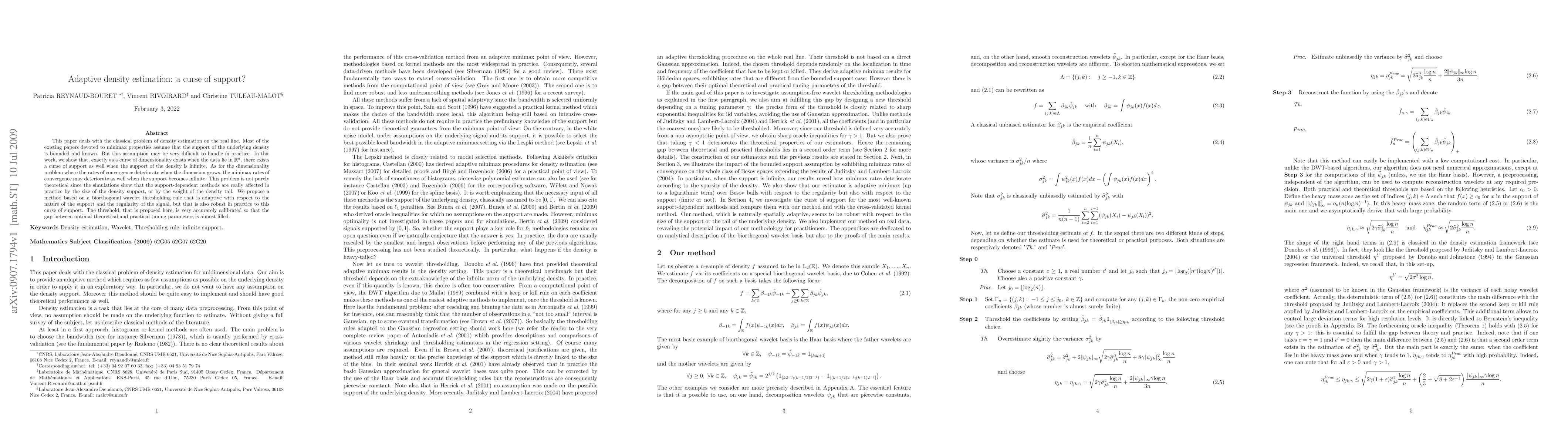 This paper introduces a new approach to density estimation that tackles the 'curse of support', where infinite supports affect convergence rates; it proposes an adaptive method using biorthogonal wavelet thresholding.