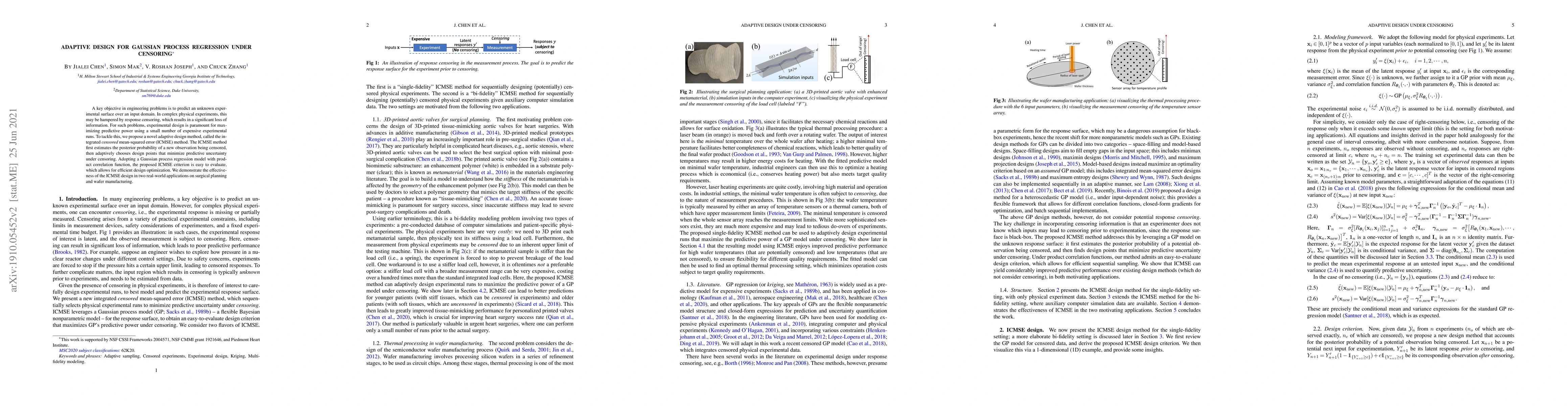 This paper proposes an adaptive design method called ICMSE for Gaussian process regression under censoring, which estimates the likelihood of censoring and selects design points to minimize predictive uncertainty. The method is effective in two applications: surgical planning and wafer manufacturing.