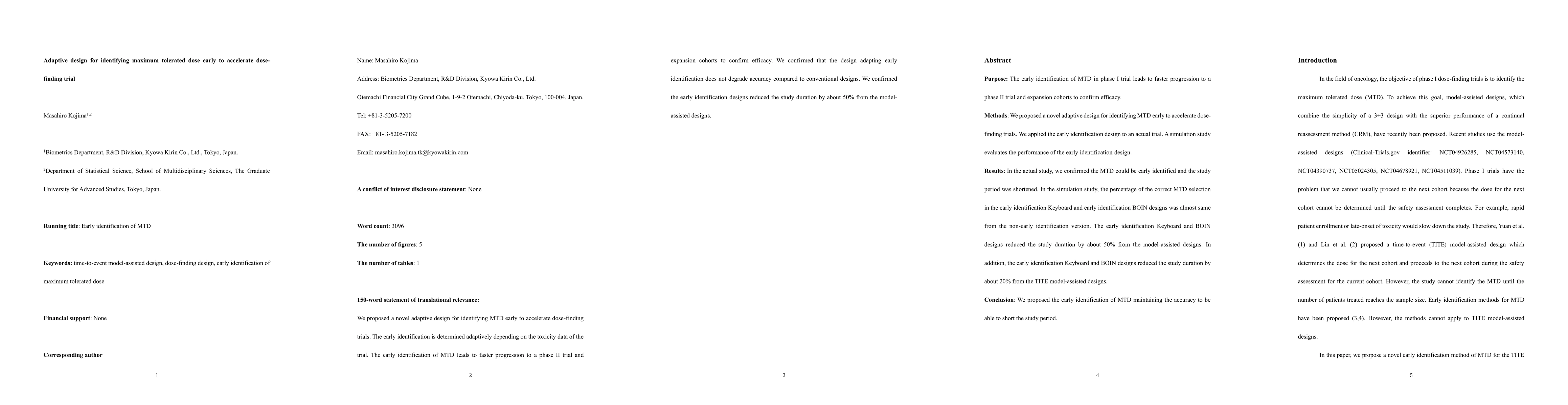 This paper proposes an adaptive design to identify the maximum tolerated dose (MTD) early in phase I trials to accelerate progression to phase II. The design uses Bayesian analysis for early MTD identification, which was successfully applied in an actual trial, shortening the study period and showing similar accuracy in MTD selection compared to traditional methods.