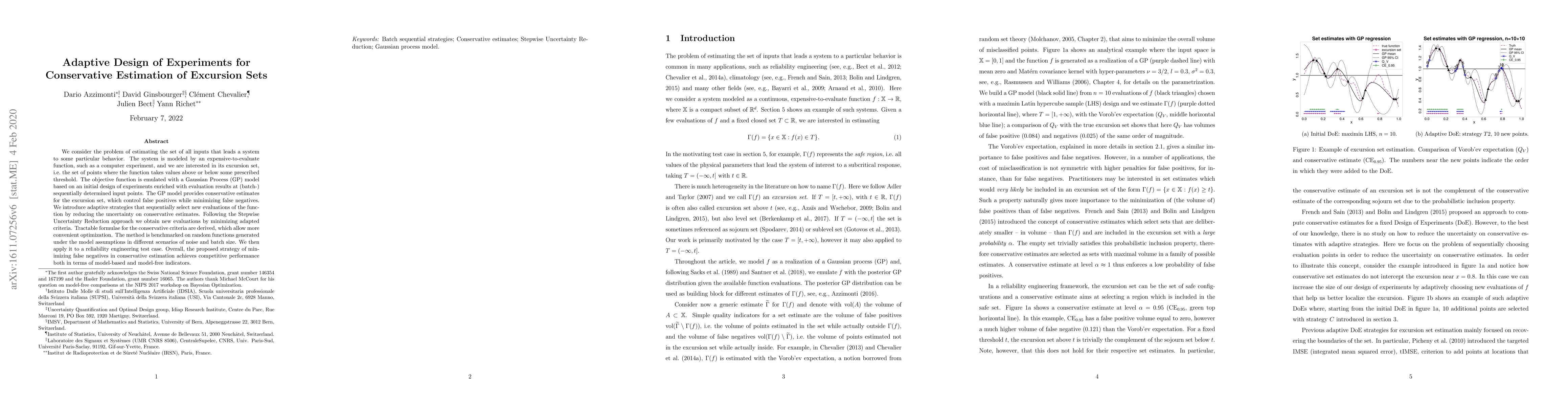 This paper proposes an adaptive design of experiments to conservatively estimate excursion sets for expensive-to-evaluate functions, using Gaussian Process models. The method sequentially selects new evaluations to minimize uncertainty, achieving competitive performance in controlling false negatives.