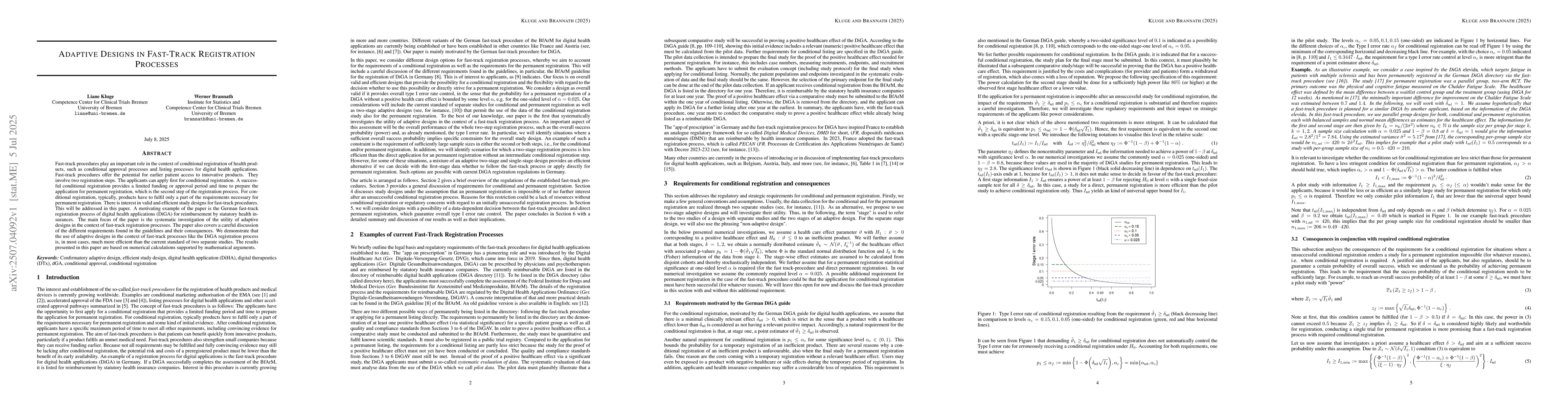 Fast-track procedures play an important role in the context of conditional registration of health products, such as conditional approval processes and listing processes for digital health applications. Fast-track procedures offer the potential for earlier patient access to innovative products. They involve two registration steps. The applicants can apply first for conditional registration. A successful conditional registration provides a limited funding or approval period and time to prepare the application for permanent registration, which is the second step of the registration process. For conditional registration, typically, products have to fulfil only a part of the requirements necessary for permanent registration. There is interest in valid and efficient study designs for fast-track procedures. This will be addressed in this paper. A motivating example of the paper is the German fast-track registration process of digital health applications (DiGA) for reimbursement by statutory health insurances. The main focus of the paper is the systematic investigation of the utility of adaptive designs in the context of fast-track registration processes. The paper also covers a careful discussion of the different requirements found in the guidelines and their consequences. We demonstrate that the use of adaptive designs in the context of fast-track processes like the DiGA registration process is, in most cases, much more efficient than the current standard of two separate studies. The results presented in this paper are based on numerical calculations supported by mathematical arguments.