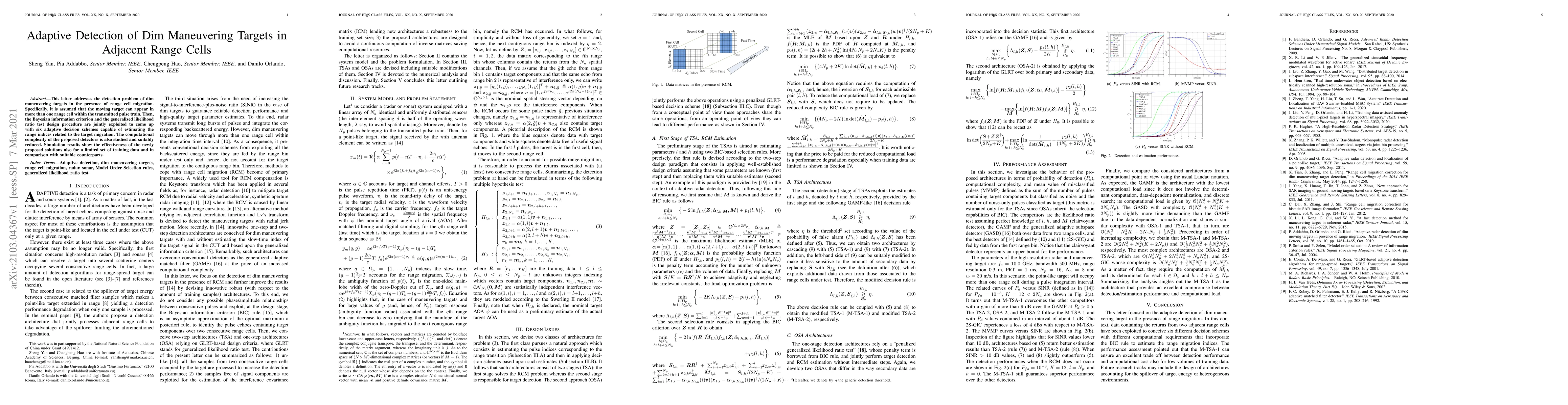 This letter addresses the detection problem of dim maneuvering targets in the presence of range cell migration. Specifically, it is assumed that the moving target can appear in more than one range cell within the transmitted pulse train. Then, the Bayesian information criterion and the generalized likelihood ratio test design procedure are jointly exploited to come up with six adaptive decision schemes capable of estimating the range indices related to the target migration. The computational complexity of the proposed detectors is also studied and suitably reduced. Simulation results show the effectiveness of the newly proposed solutions also for a limited set of training data and in comparison with suitable counterparts.
