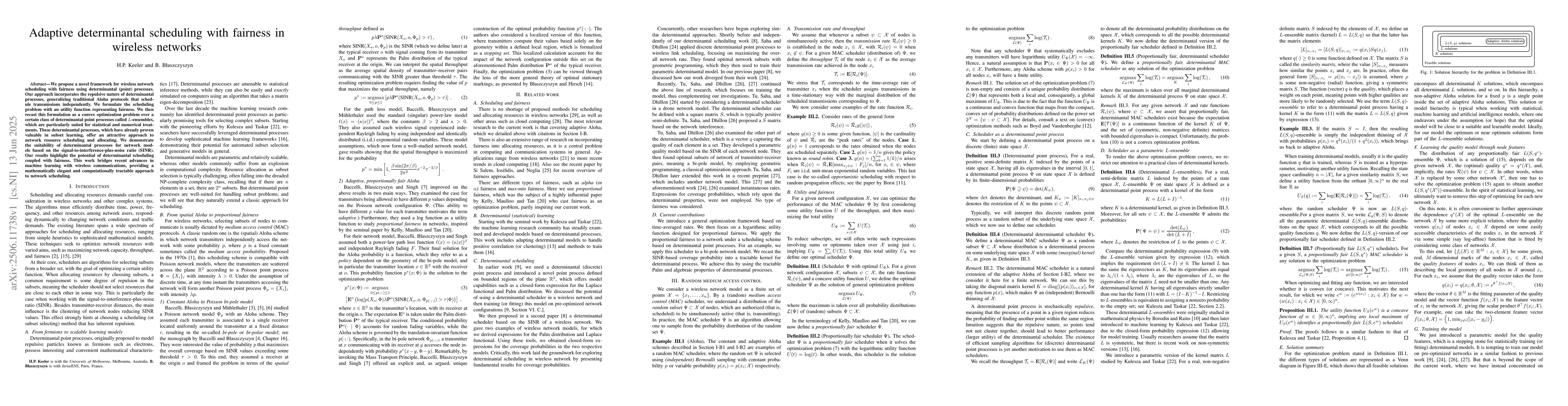 This research introduces an adaptive scheduling framework for wireless networks using determinantal point processes, enhancing fairness and efficiency beyond traditional Aloha protocols. The method, based on convex optimization over L-ensembles, offers a computationally efficient approach to resource allocation, demonstrating potential in SINR-based network models.