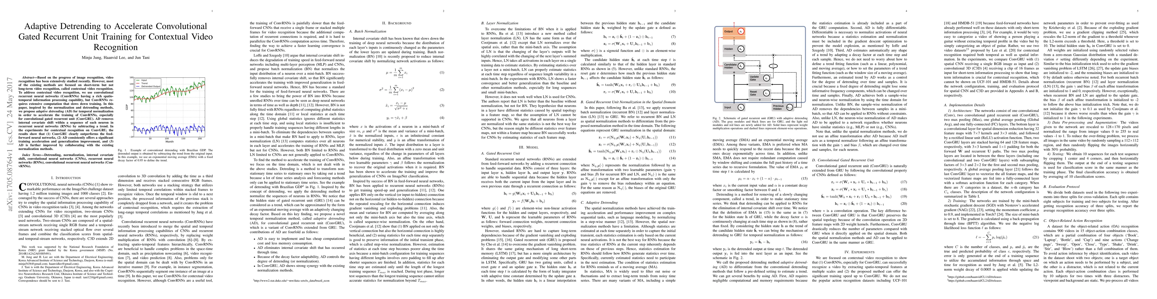 This paper proposes adaptive detrending (AD) to accelerate the training of convolutional gated recurrent units (ConvGRU) for contextual video recognition. AD effectively removes internal covariate shift within RNN sequences, leading to significant training acceleration and improved generalization.