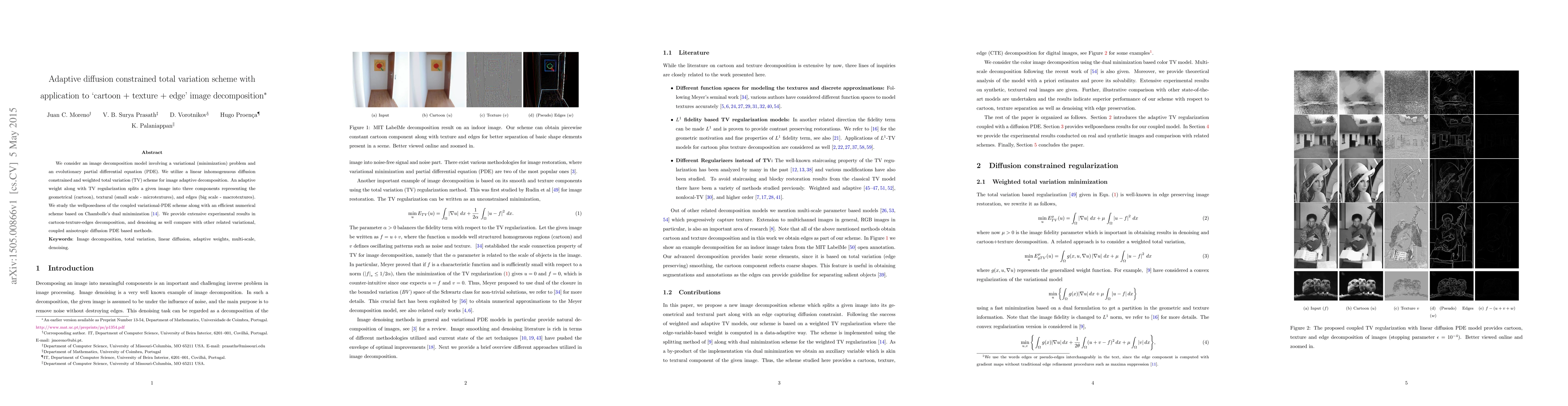 This paper proposes an adaptive diffusion constrained total variation scheme for decomposing images into cartoon, texture, and edge components. The method combines variational optimization and PDEs, ensuring wellposedness and efficiency through Chambolle's dual minimization, with experimental results demonstrating its effectiveness in decomposition and denoising.