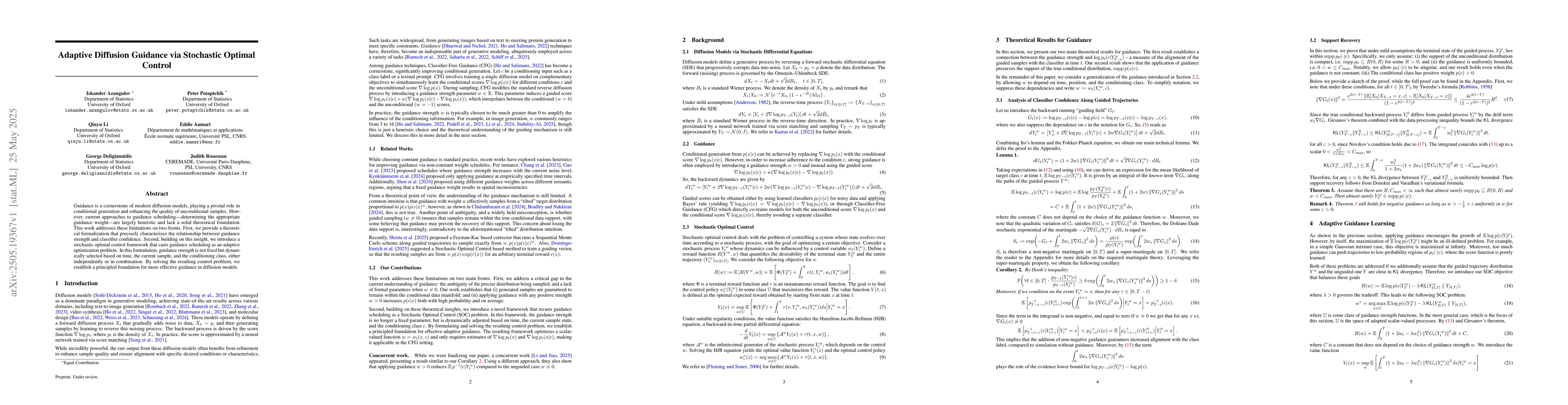 The paper proposes a theoretical formalization and a stochastic optimal control framework for adaptive guidance scheduling in diffusion models, dynamically selecting guidance strength based on time, current sample, and conditioning class.