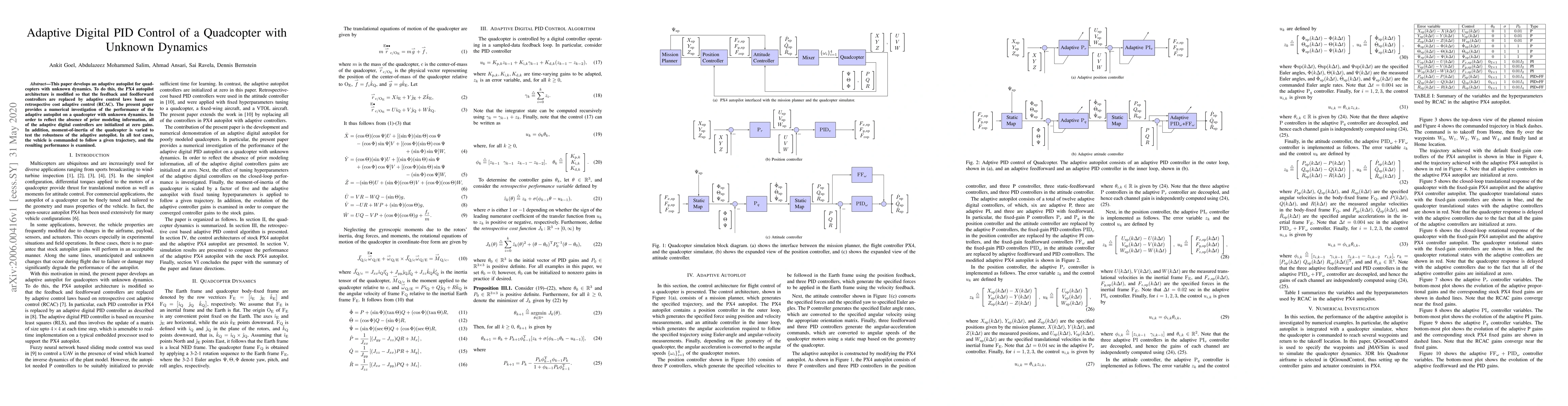 This paper develops an adaptive autopilot for quadcopters with unknown dynamics. To do this, the PX4 autopilot architecture is modified so that the feedback and feedforward controllers are replaced by adaptive control laws based on retrospective cost adaptive control (RCAC). The present paper provides a numerical investigation of the performance of the adaptive autopilot on a quadcopter with unknown dynamics. In order to reflect the absence of prior modeling information, all of the adaptive digital controllers are initialized at zero gains. In addition, moment-of-inertia of the quadcopter is varied to test the robustness of the adaptive autopilot. In all test cases, the vehicle is commanded to follow a given trajectory, and the resulting performance is examined.