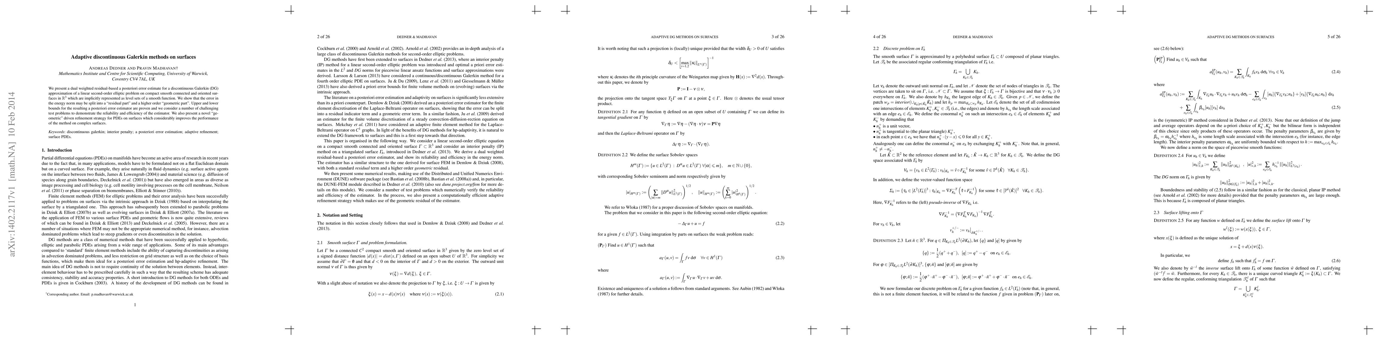 Researchers developed a method for solving linear second-order elliptic problems on smooth surfaces in 3D space, using adaptive discontinuous Galerkin methods. They also introduced a new refinement strategy that improves performance on complex surfaces.