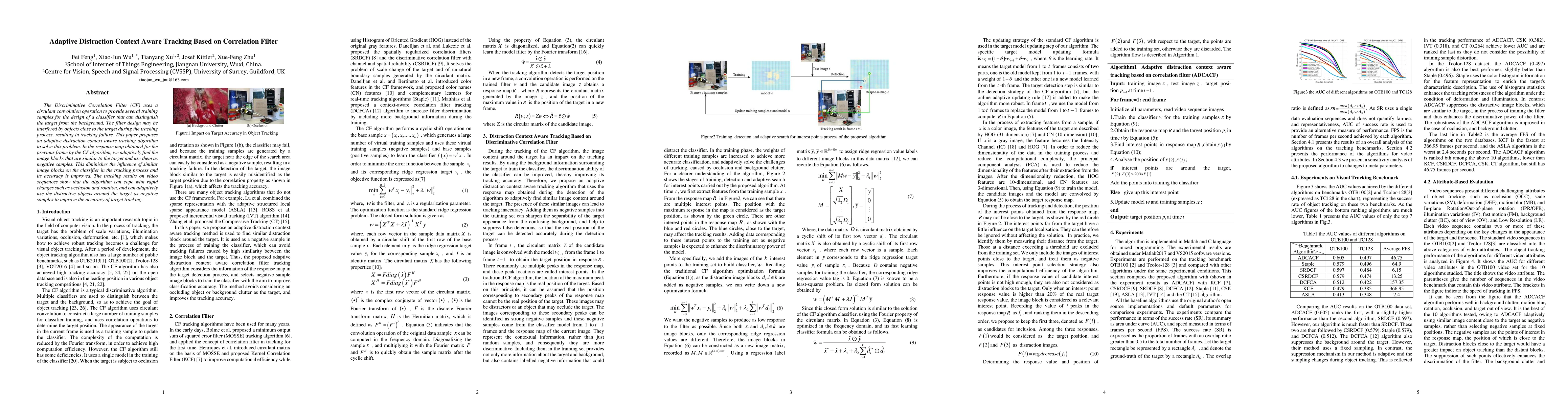 This paper proposes an adaptive distraction context aware tracking algorithm that improves target tracking accuracy by using distractive objects as negative samples, enabling it to cope with rapid changes such as occlusion and rotation.