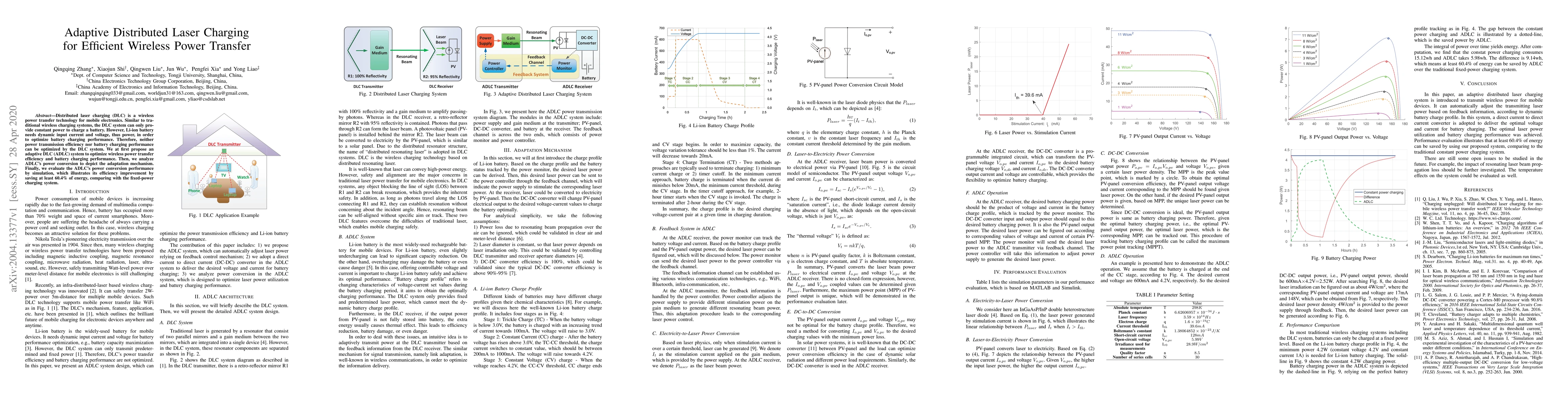This paper proposes an adaptive distributed laser charging (ADLC) system to optimize wireless power transfer efficiency and battery charging performance for mobile electronics, achieving at least 60.4% energy savings compared to traditional fixed-power systems through simulation.