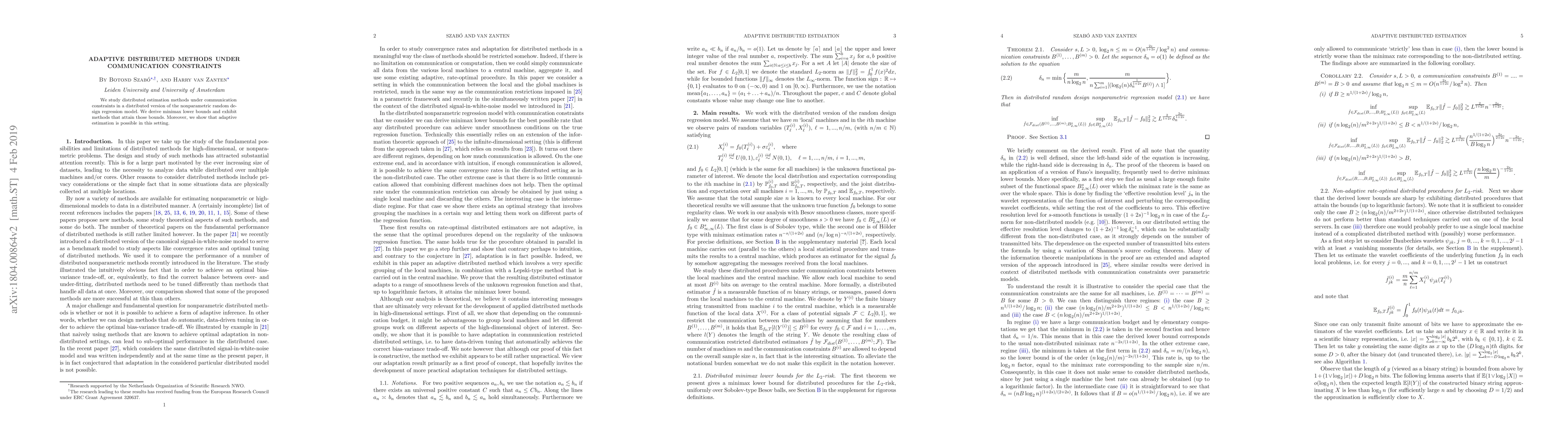 The paper studies distributed estimation methods under communication constraints in a distributed version of the nonparametric random design regression model, deriving minimax lower bounds and exhibiting methods that attain those bounds. It also demonstrates the possibility of adaptive estimation in this setting.