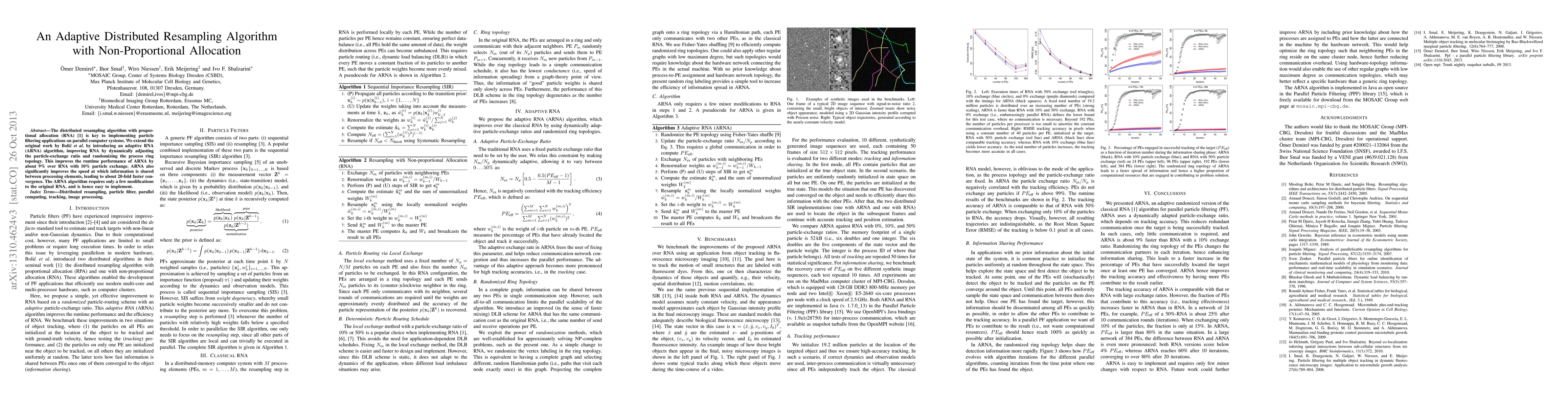 The distributed resampling algorithm with proportional allocation (RNA) is key to implementing particle filtering applications on parallel computer systems. We extend the original work by Bolic et al. by introducing an adaptive RNA (ARNA) algorithm, improving RNA by dynamically adjusting the particle-exchange ratio and randomizing the process ring topology. This improves the runtime performance of ARNA by about 9% over RNA with 10% particle exchange. ARNA also significantly improves the speed at which information is shared between processing elements, leading to about 20-fold faster convergence. The ARNA algorithm requires only a few modifications to the original RNA, and is hence easy to implement.