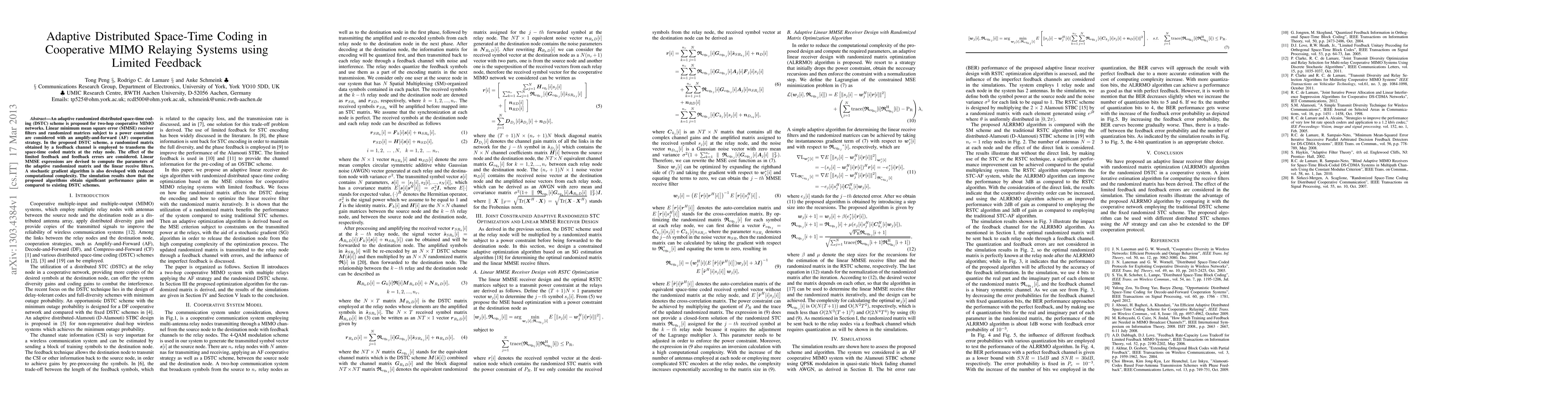 This paper proposes an adaptive randomized distributed space-time coding scheme for two-hop cooperative MIMO relay networks using limited feedback. It employs linear MMSE receiver filters and randomized matrices with an amplify-and-forward strategy, achieving significant performance gains over existing methods, as demonstrated by simulations.