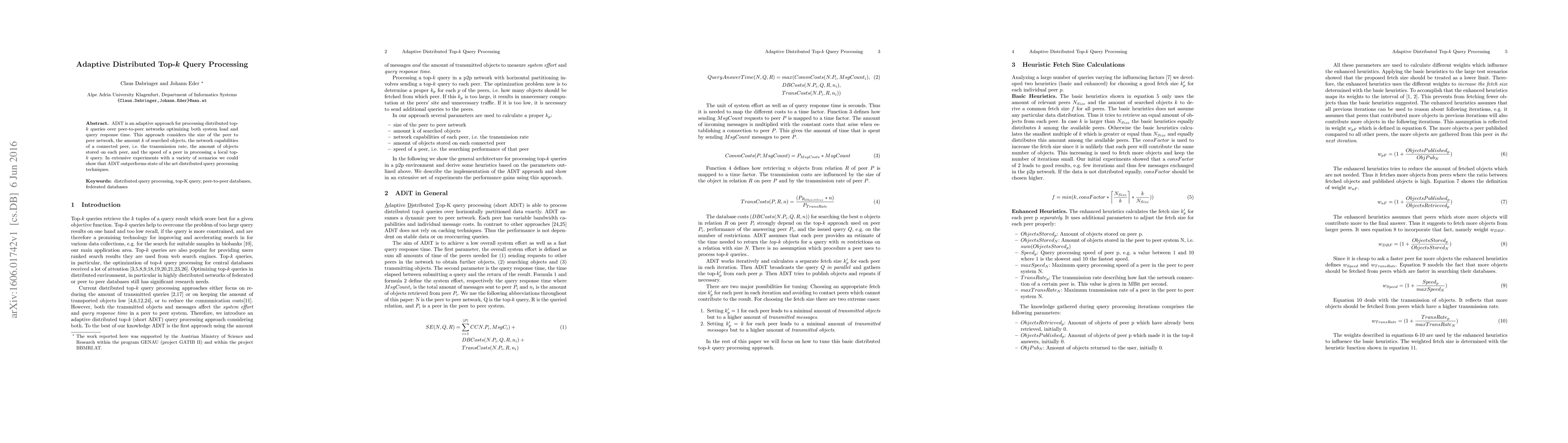 ADiT is an adaptive approach for processing distributed top-$k$ queries over peer-to-peer networks optimizing both system load and query response time. This approach considers the size of the peer to peer network, the amount $k$ of searched objects, the network capabilities of a connected peer, i.e. the transmission rate, the amount of objects stored on each peer, and the speed of a peer in processing a local top-$k$ query. In extensive experiments with a variety of scenarios we could show that ADiT outperforms state of the art distributed query processing techniques.