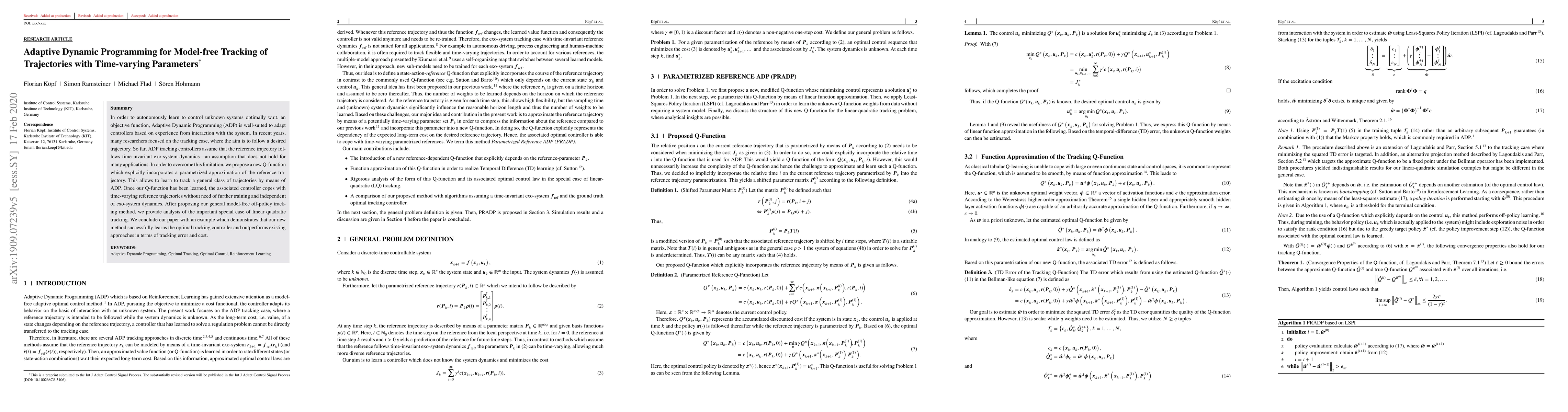 This paper proposes an Adaptive Dynamic Programming (ADP) method for model-free tracking of time-varying trajectories by introducing a new Q-function that incorporates a parametrized approximation of the reference trajectory. The method successfully learns the optimal tracking controller without further training, outperforming existing approaches in tracking error and cost.