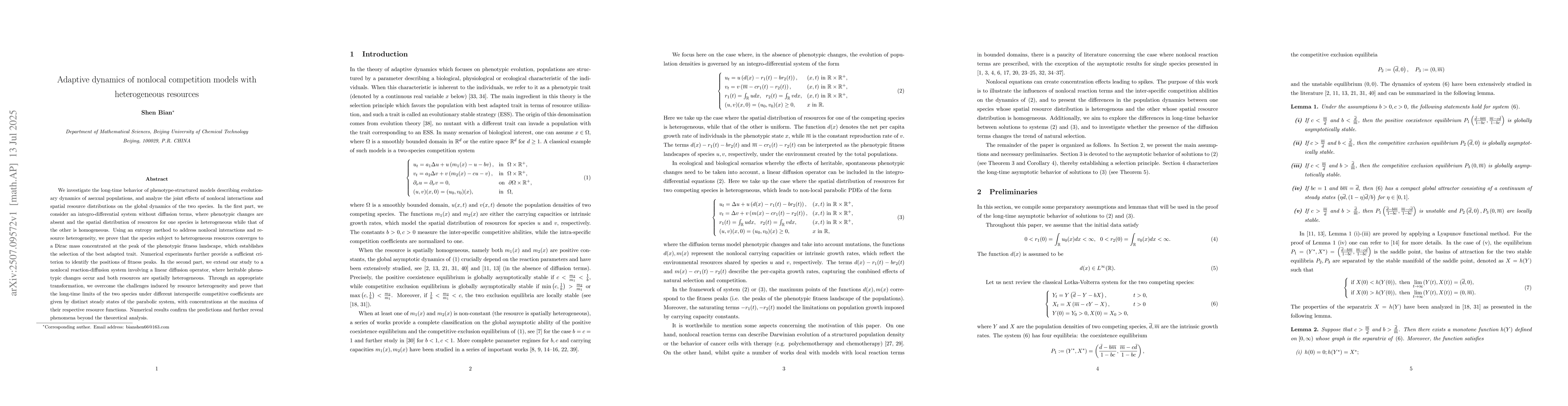 We investigate the long-time behavior of phenotype-structured models describing evolutionary dynamics of asexual populations, and analyze the joint effects of nonlocal interactions and spatial resource distributions on the global dynamics of the two species. In the first part, we consider an integro-differential system without diffusion terms, where phenotypic changes are absent and the spatial distribution of resources for one species is heterogeneous while that of the other is homogeneous. Using an entropy method to address nonlocal interactions and resource heterogeneity, we prove that the species subject to heterogeneous resources converges to a Dirac mass concentrated at the peak of the phenotypic fitness landscape, which establishes the selection of the best adapted trait. Numerical experiments further provide a sufficient criterion to identify the positions of fitness peaks. In the second part, we extend our study to a nonlocal reaction-diffusion system involving a linear diffusion operator, where heritable phenotypic changes occur and both resources are spatially heterogeneous. Through an appropriate transformation, we overcome the challenges induced by resource heterogeneity and prove that the long-time limits of the two species under different interspecific competitive coefficients are given by distinct steady states of the parabolic system, with concentrations at the maxima of their respective resource functions. Numerical results confirm the predictions and further reveal phenomena beyond the theoretical analysis.
