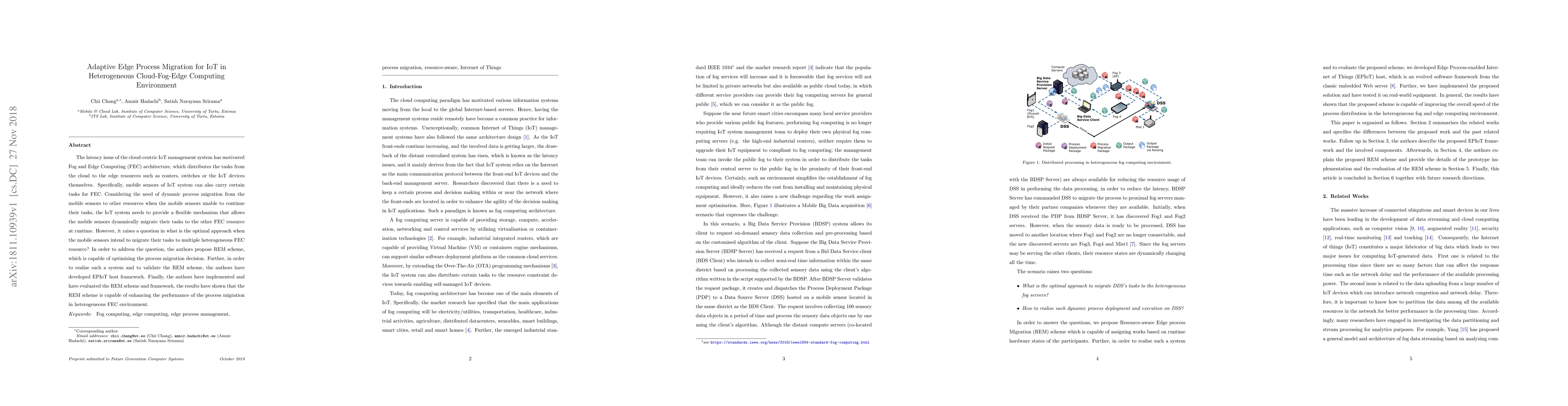 The paper proposes a REM scheme to optimize task migration in IoT systems across heterogeneous Fog and Edge Computing resources, addressing latency issues. The authors developed an EPIoT host framework and evaluated the REM scheme, demonstrating improved performance in process migration.