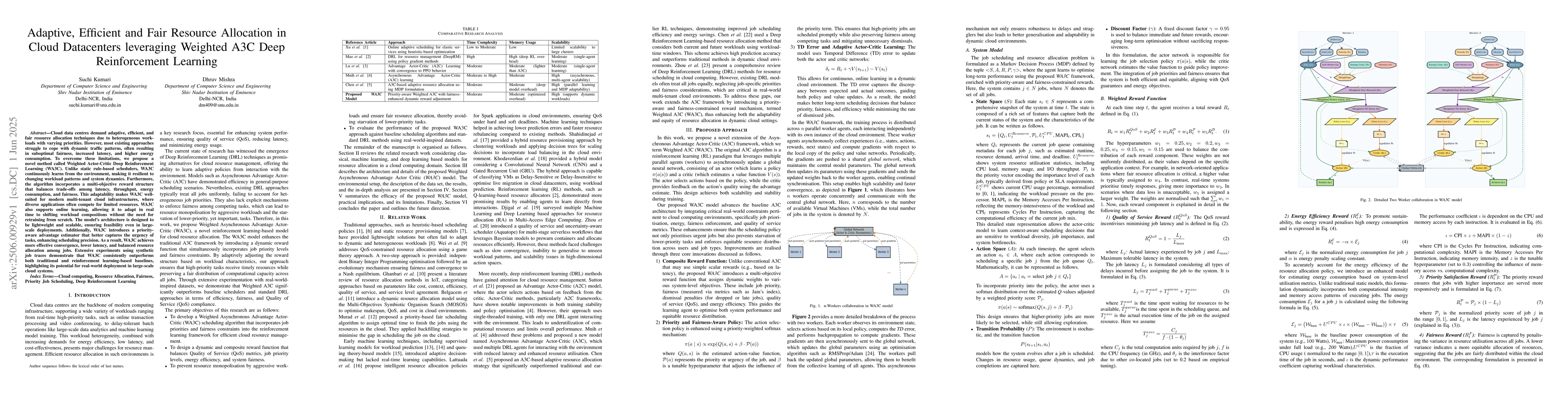 A new method called Weighted Actor-Critic Deep Reinforcement Learning (WA3C) is proposed to efficiently allocate resources in cloud datacenters while balancing fairness, latency, energy consumption, and throughput, outperforming traditional and reinforcement learning-based baselines.