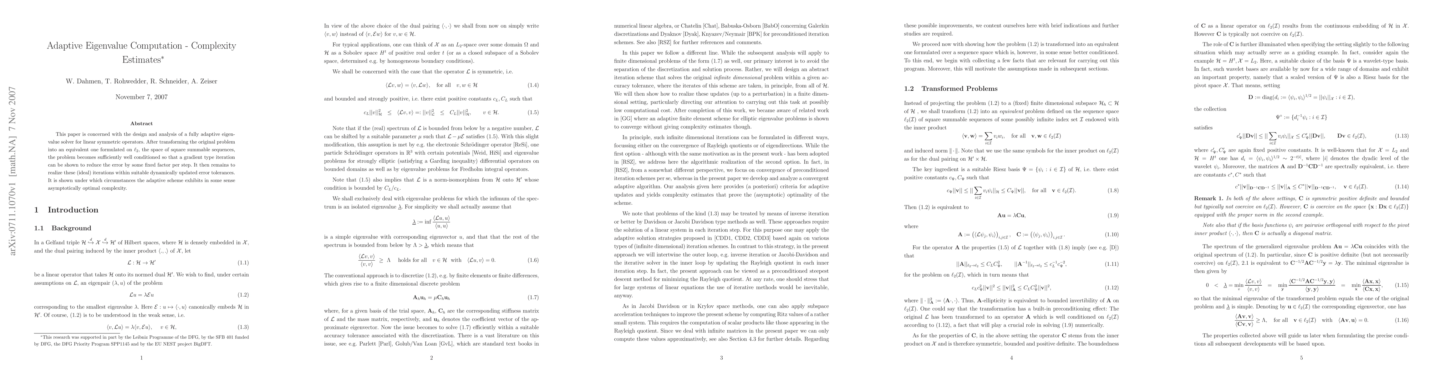 Researchers designed a fully adaptive eigenvalue solver for linear symmetric operators, showing it can reduce error by a fixed factor per step. Under certain conditions, the scheme exhibits asymptotically optimal complexity.