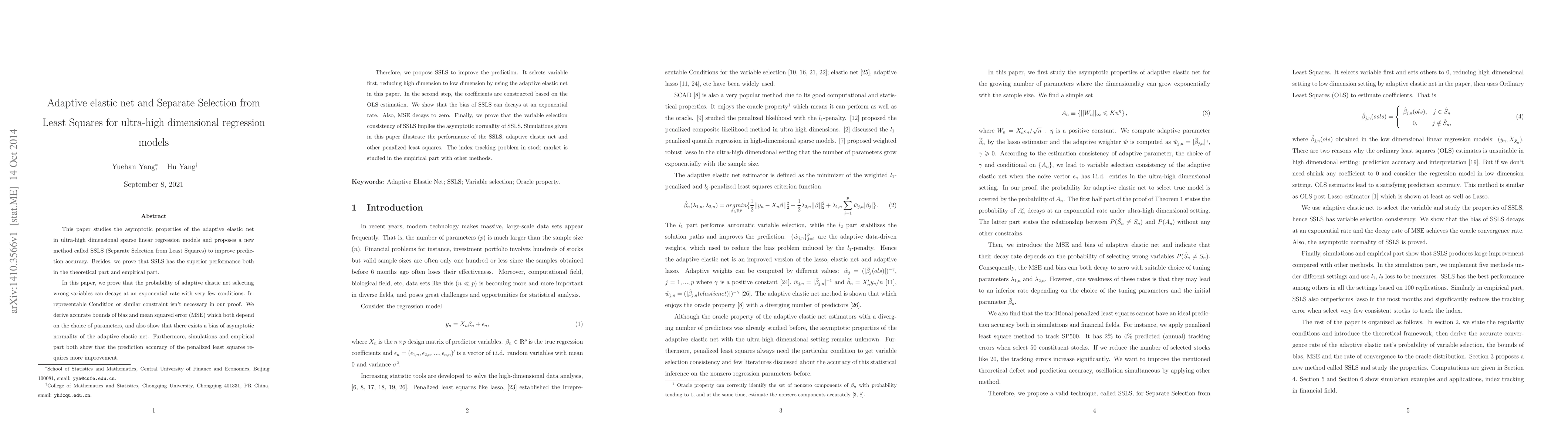 This paper studies the asymptotic properties of the adaptive elastic net in ultra-high dimensional sparse linear regression models and proposes a new method called SSLS (Separate Selection from Least Squares) to improve prediction accuracy. Besides, we prove that SSLS has the superior performance both in the theoretical part and empirical part. In this paper, we prove that the probability of adaptive elastic net selecting wrong variables can decays at an exponential rate with very few conditions. Irrepresentable Condition or similar constraint isn't necessary in our proof. We derive accurate bounds of bias and mean squared error (MSE) which both depend on the choice of parameters, and also show that there exists a bias of asymptotic normality of the adaptive elastic net. Furthermore, simulations and empirical part both show that the prediction accuracy of the penalized least squares requires more improvement. Therefore, we propose SSLS to improve the prediction. It selects variable first, reducing high dimension to low dimension by using the adaptive elastic net in this paper. In the second step, the coefficients are constructed based on the OLS estimation. We show that the bias of SSLS can decays at an exponential rate. Also, MSE decays to zero. Finally, we prove that the variable selection consistency of SSLS implies the asymptotic normality of SSLS. Simulations given in this paper illustrate the performance of the SSLS, adaptive elastic net and other penalized least squares. The index tracking problem in stock market is studied in the empirical part with other methods.