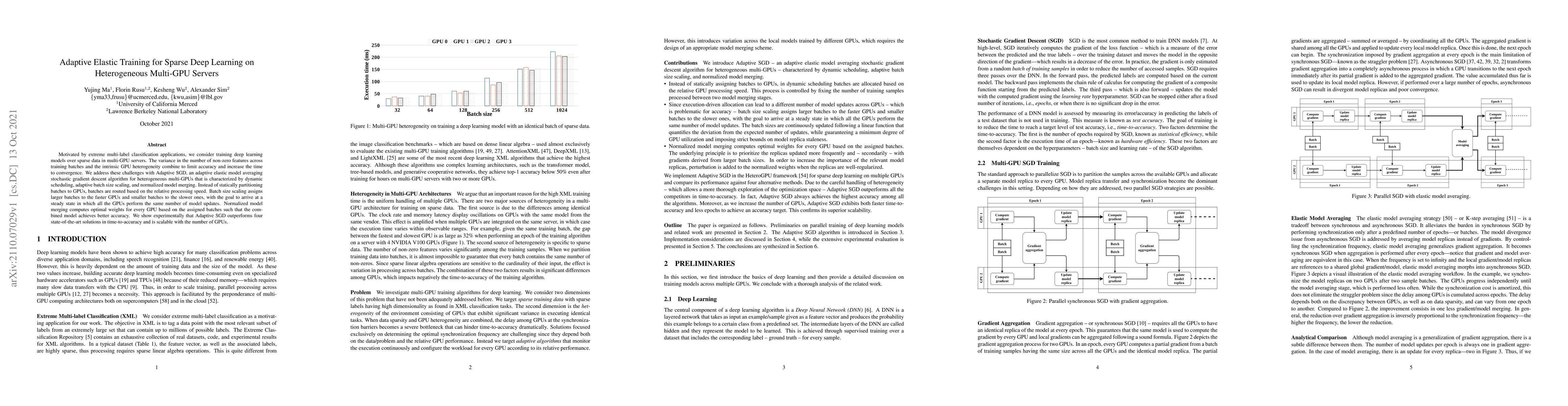 This paper proposes Adaptive SGD, an adaptive elastic model averaging algorithm for training sparse deep learning models on heterogeneous multi-GPU servers. It dynamically schedules batches based on GPU speed, scales batch sizes adaptively, and merges models optimally to improve accuracy and convergence speed, outperforming four state-of-the-art solutions.