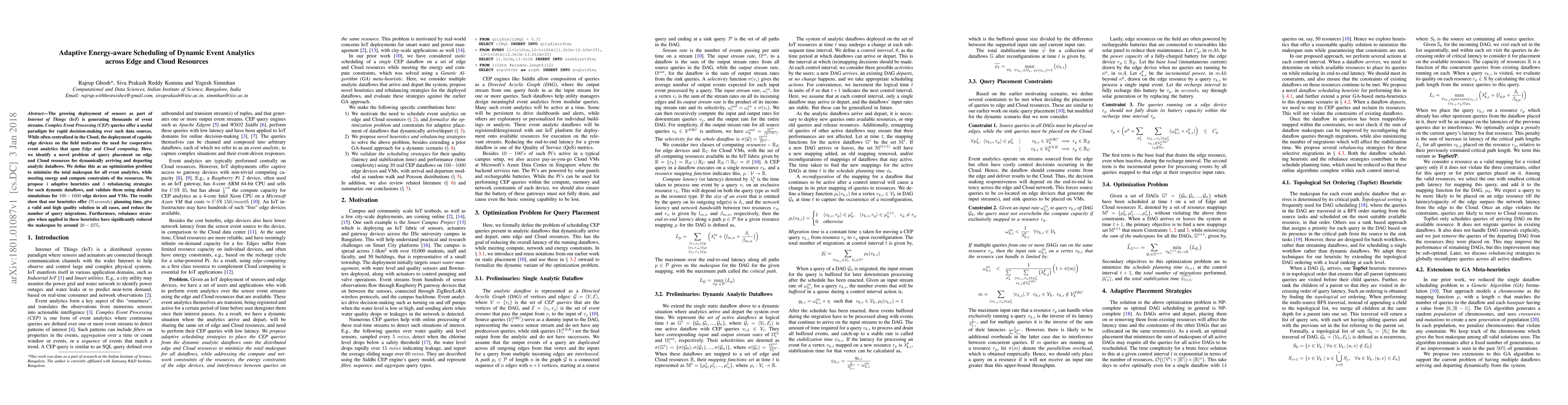 This paper proposes adaptive heuristics and rebalancing strategies for scheduling dynamic event analytics across edge and cloud resources to minimize makespan while adhering to energy and compute constraints. Simulation results show that the proposed methods achieve O(seconds) planning time, high-quality solutions, and a 20-25% reduction in makespan through effective query migration management.