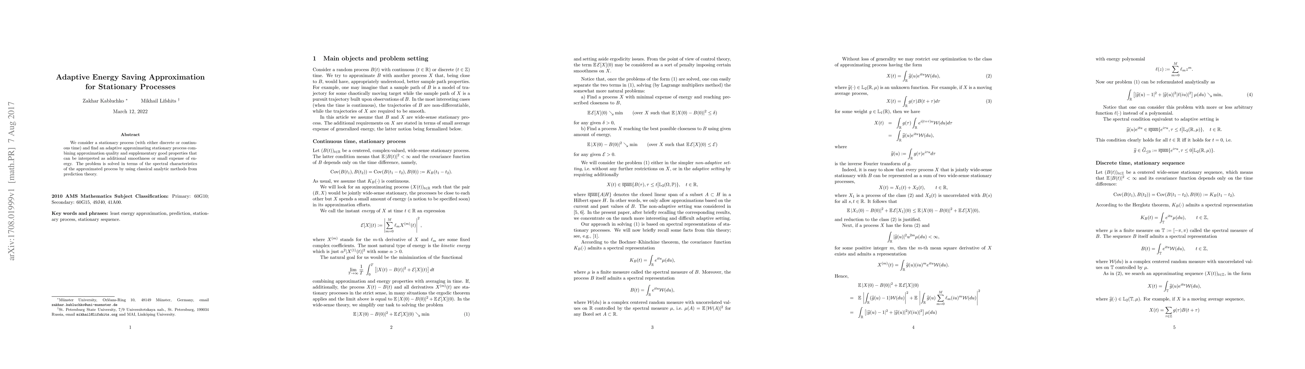 We consider a stationary process (with either discrete or continuous time) and find an adaptive approximating stationary process combining approximation quality and supplementary good properties that can be interpreted as additional smoothness or small expense of energy. The problem is solved in terms of the spectral characteristics of the approximated process by using classical analytic methods from prediction theory.