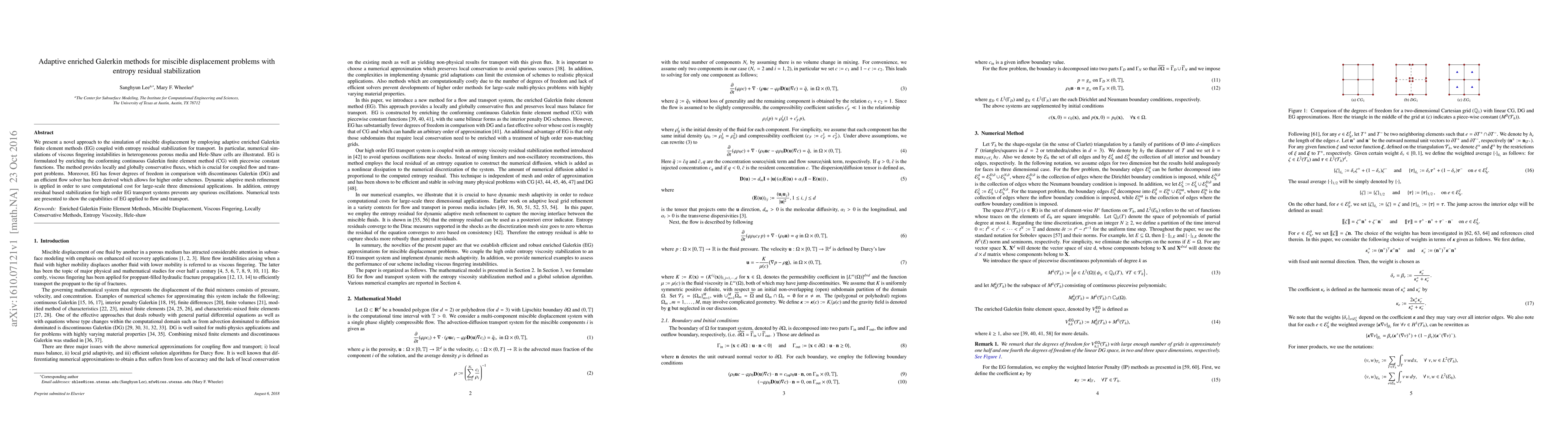 This paper introduces adaptive enriched Galerkin (EG) methods for simulating miscible displacement, combining EG with entropy residual stabilization to handle transport in heterogeneous porous media. The method is shown to efficiently manage viscous fingering instabilities and reduce computational costs through dynamic mesh refinement.