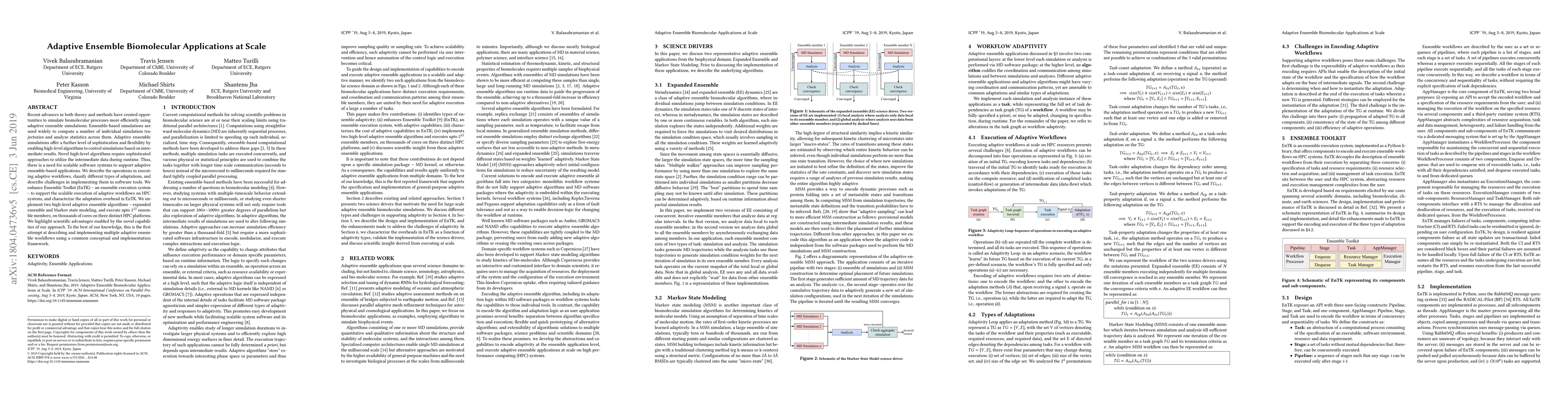 Recent advances in both theory and methods have created opportunities to simulate biomolecular processes more efficiently using adaptive ensemble simulations. Ensemble-based simulations are used widely to compute a number of individual simulation trajectories and analyze statistics across them. Adaptive ensemble simulations offer a further level of sophistication and flexibility by enabling high-level algorithms to control simulations based on intermediate results. Novel high-level algorithms require sophisticated approaches to utilize the intermediate data during runtime. Thus, there is a need for scalable software systems to support adaptive ensemble-based applications. We describe the operations in executing adaptive workflows, classify different types of adaptations, and describe challenges in implementing them in software tools. We enhance Ensemble Toolkit (EnTK) -- an ensemble execution system -- to support the scalable execution of adaptive workflows on HPC systems, and characterize the adaptation overhead in EnTK. We implement two high-level adaptive ensemble algorithms -- expanded ensemble and Markov state modeling, and execute upto $2^{12}$ ensemble members, on thousands of cores on three distinct HPC platforms. We highlight scientific advantages enabled by the novel capabilities of our approach. To the best of our knowledge, this is the first attempt at describing and implementing multiple adaptive ensemble workflows using a common conceptual and implementation framework.